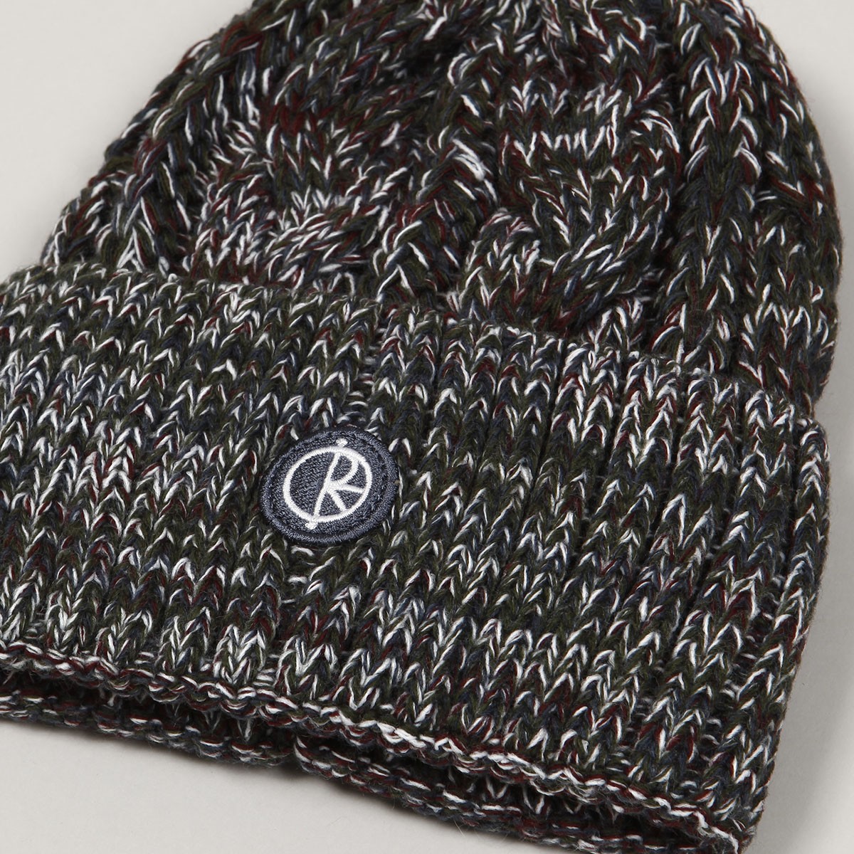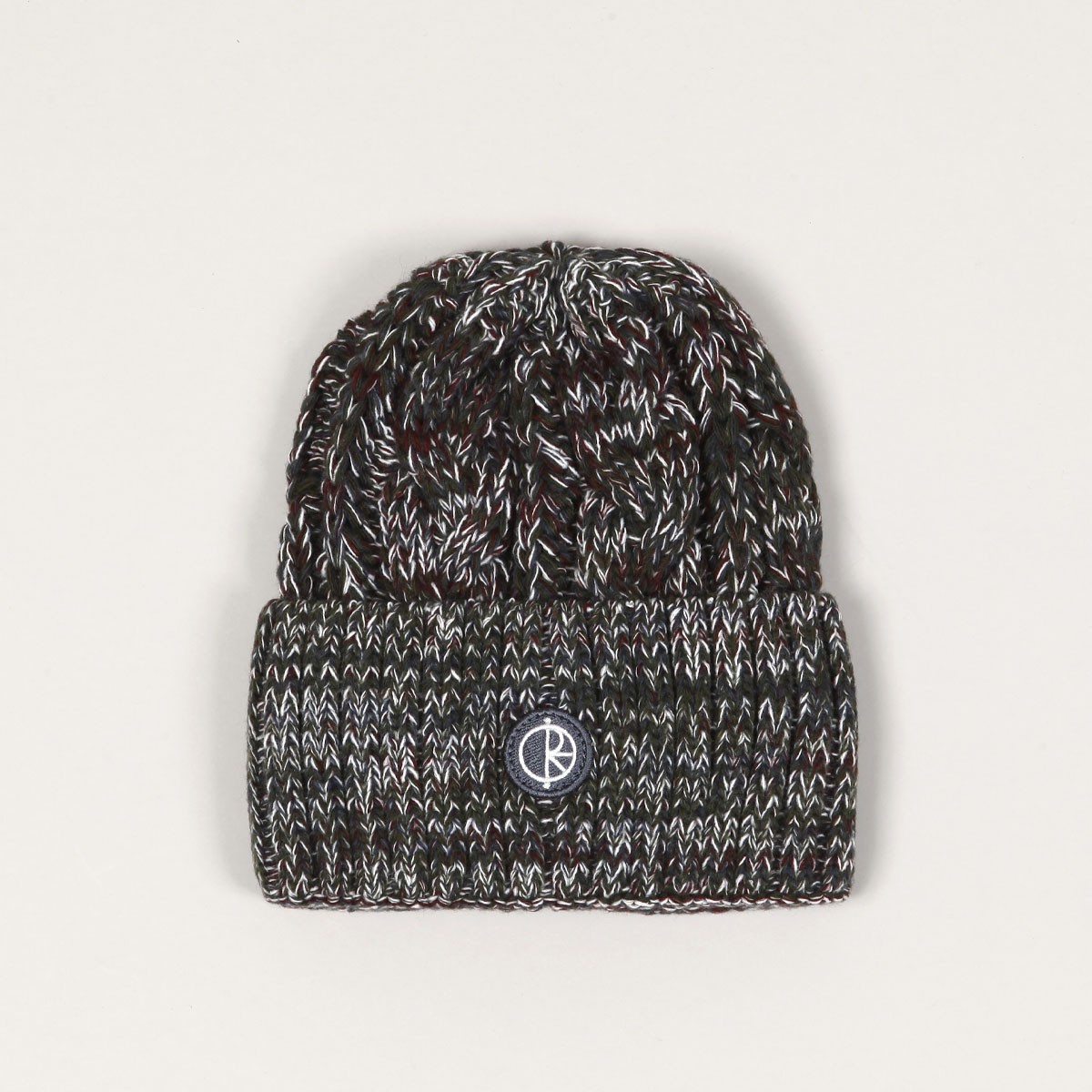 Braid Beanie má širší přeložený lem s kulatou nášivkou loga Polar na čele.