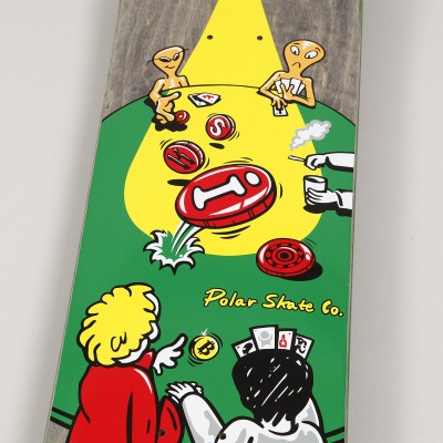 Deska POLAR Skate Co z dílny legendárního skatera Pontuse Alva. Pro-model ridera Oskiho Rozenberga Hallberga s názvem Poker Face. Grafika pokerové partie s mimozemšťany. Artwork vytvořil Jacob Ovgren. Vrchní barvená strana desky se může lišit oproti fotce. K desce dodáváme grip zdarma. Deska má kratší "short" shape.