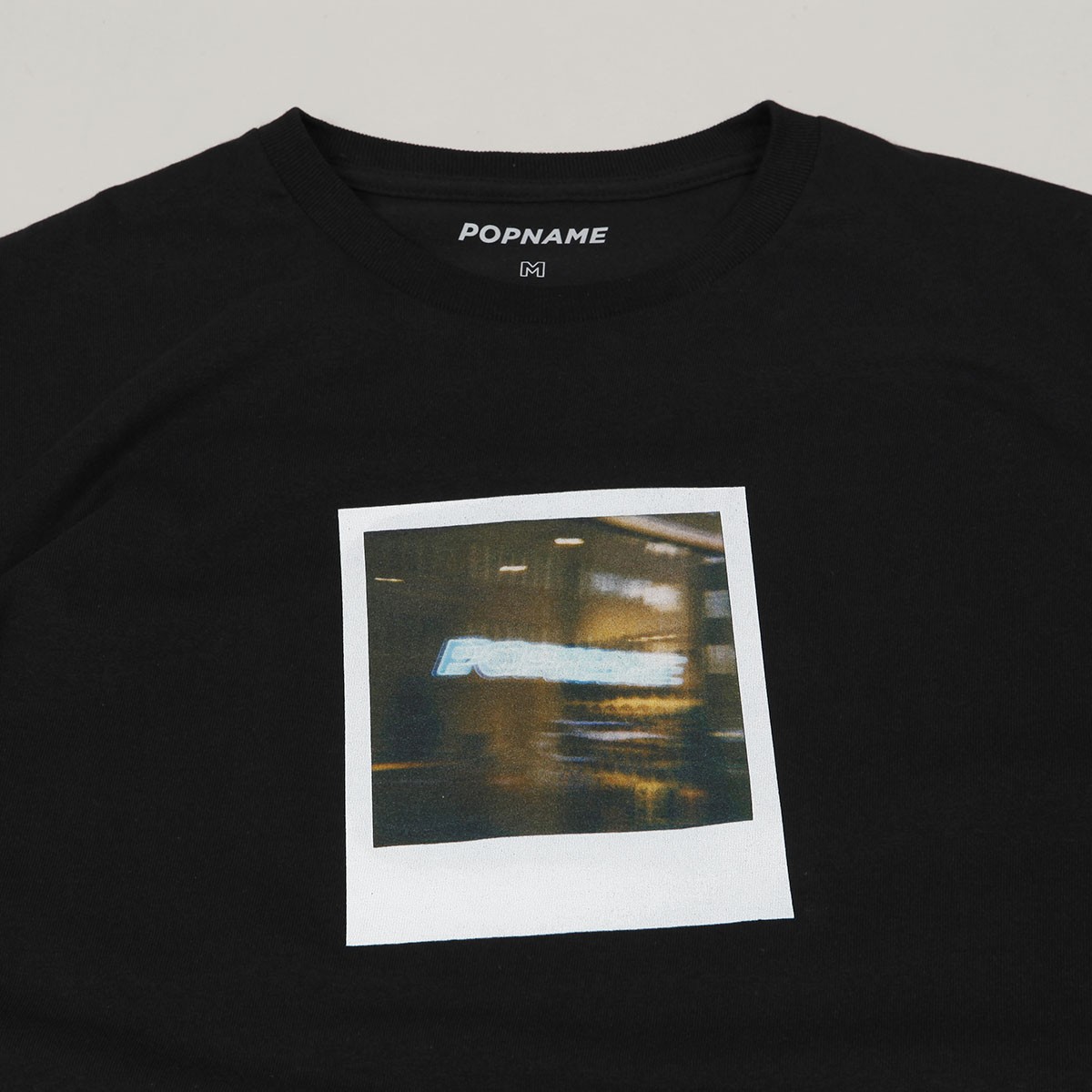 Triko v černé barvě s krátkým rukávem a potiskem polaroidové fotografie s neonovým logem POPNAME na prsou. 669Triko je vyrobeno z velice pohodlné česané a vyztužené 100% bavlny s gramáží 203 g/m2 a s dvojitým prošíváním lemů. Střih je unisexový s regular fitem. Design vytvořil Kubo Krížo.