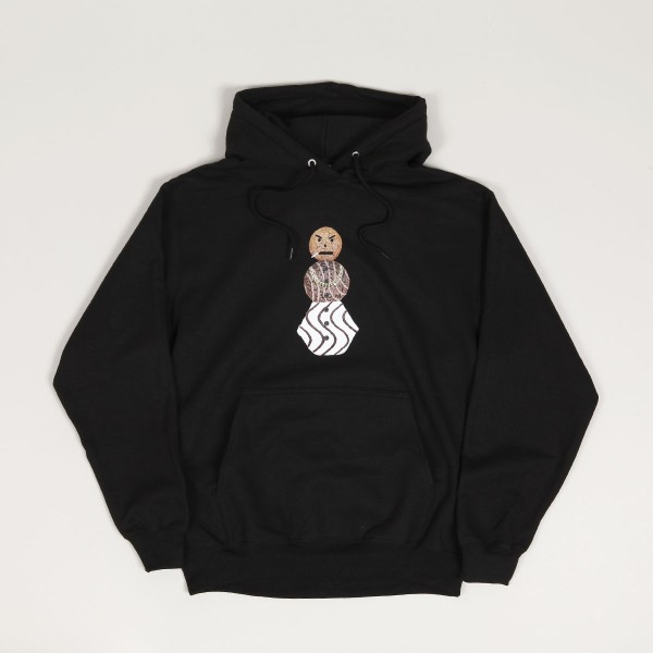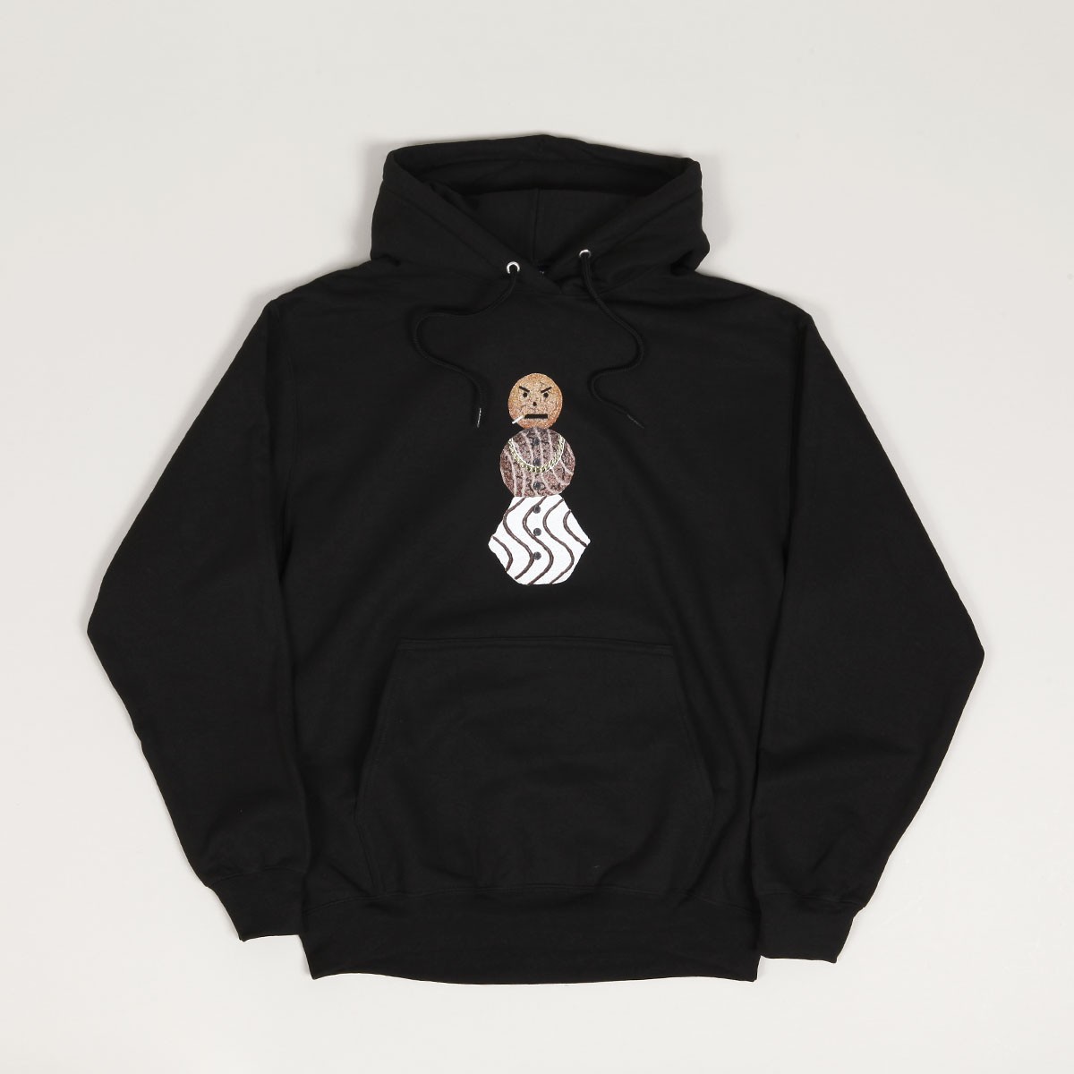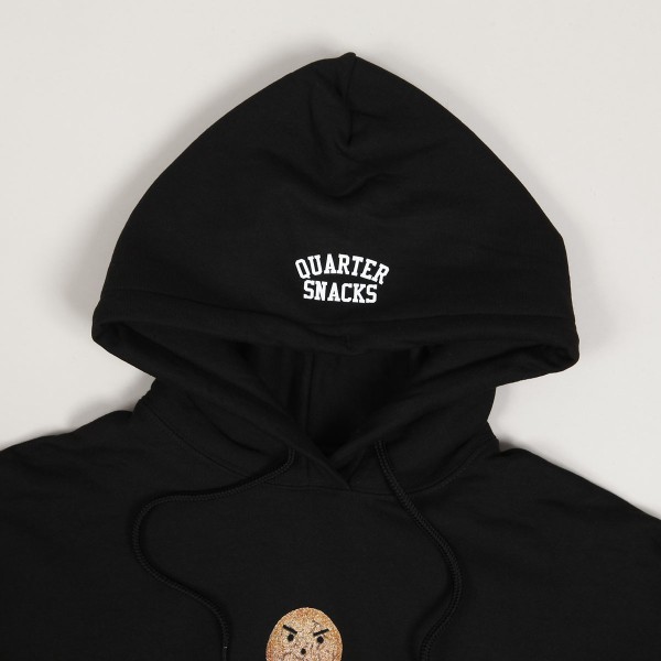 Mikina Quartersnacks s názvem Snackman Hoodie v černé barvě. Na prsou potisk Snackmana vytvořeného z různých svačinek. Motiv připomíná sněhuláka. Na kapuci kontrastní logo Quartersnacks. Kapuce se stahováním na tkaničku a velká přední kapsa. Žebrované, elastické konce rukávů a pas. Materiál 100% bavlna.