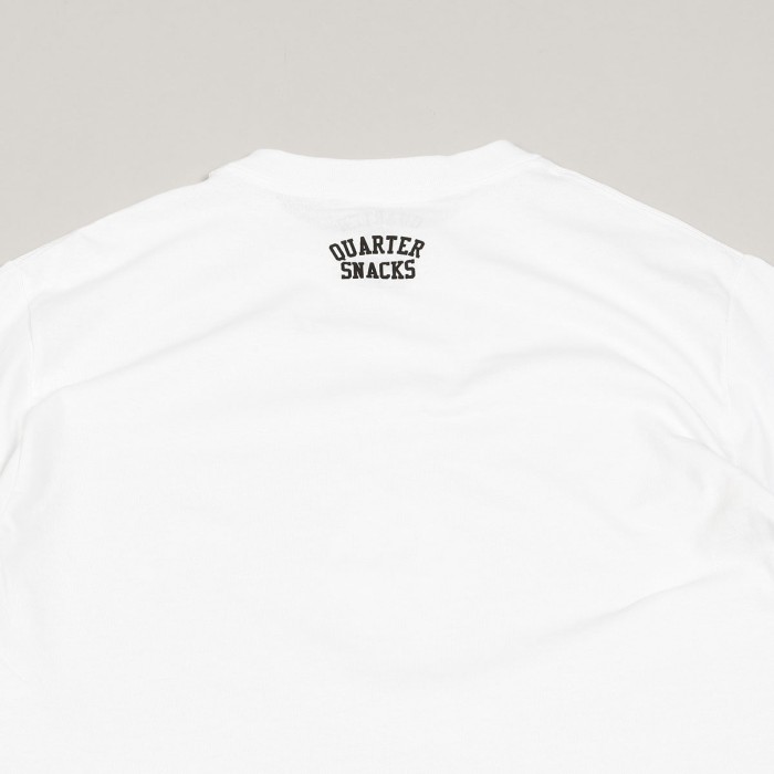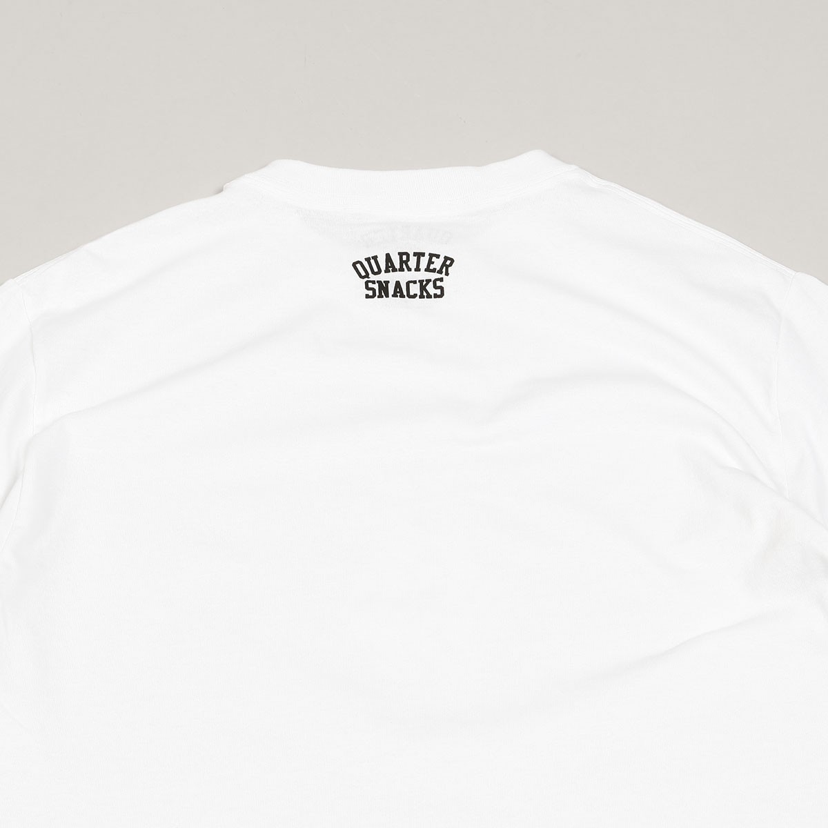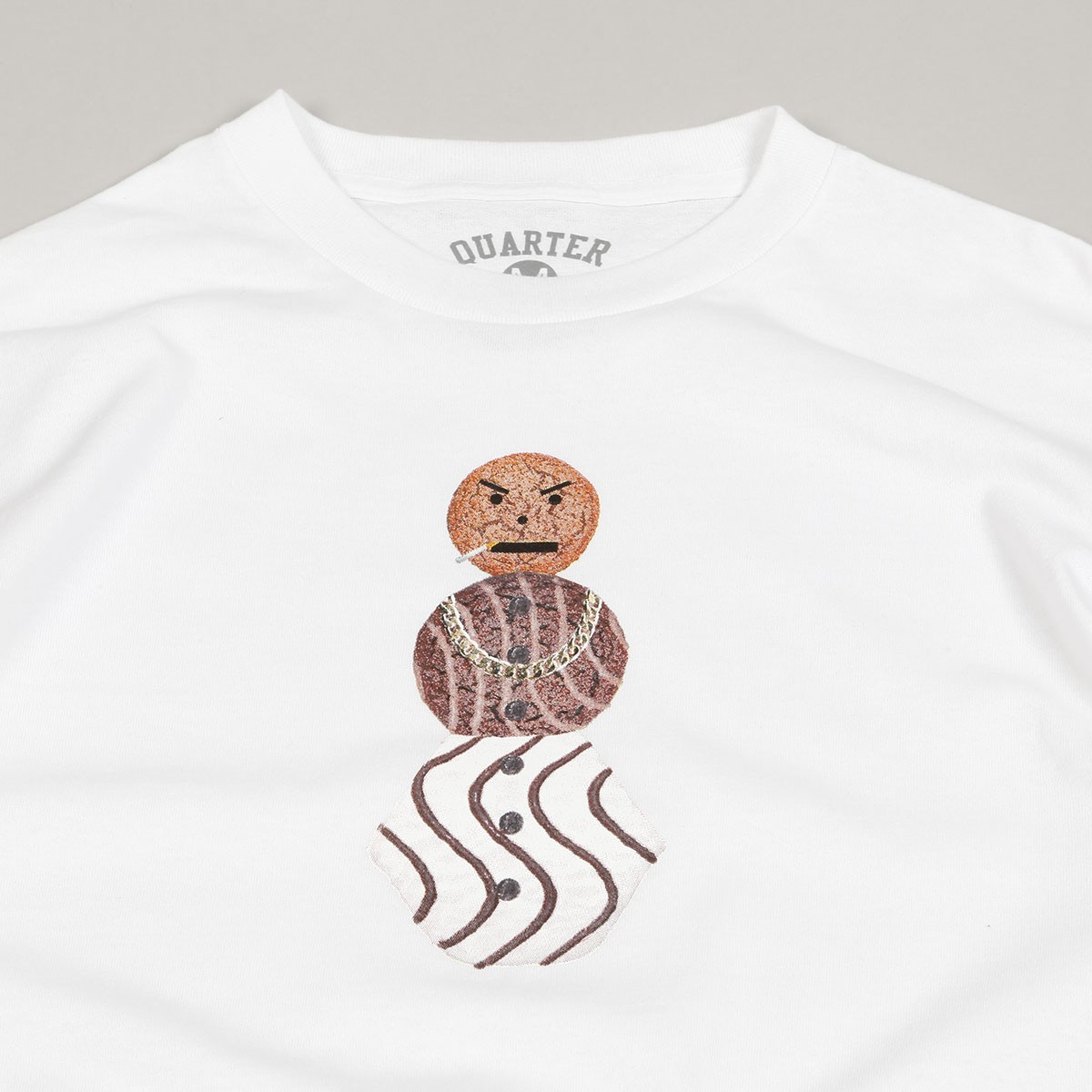Triko Quartersnack s názvem Front Snackman Tee v bílé barvě. Na prsou potisk Snackmana vytvořeného z různých svačinek. Motiv připomíná sněhuláka. Za krkem kontrastní logo Quartersnacks. Materiál 100% bavlna.