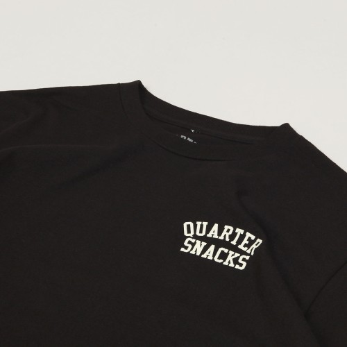 Triko Quartersnack s názvem Medusa Snackman Tee v černé barvě. Na levé straně prsou potisk kontrastního loga Quartersnacks a na zádech grafika Snackmana vytvořeného z různých svačinek. Motiv připomíná sněhuláka a je upraven do podoby Medusy. Materiál 100% bavlna.