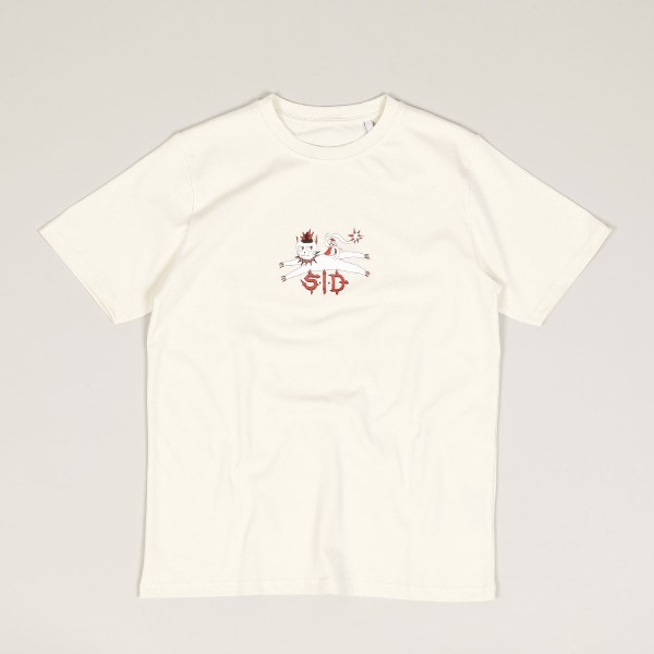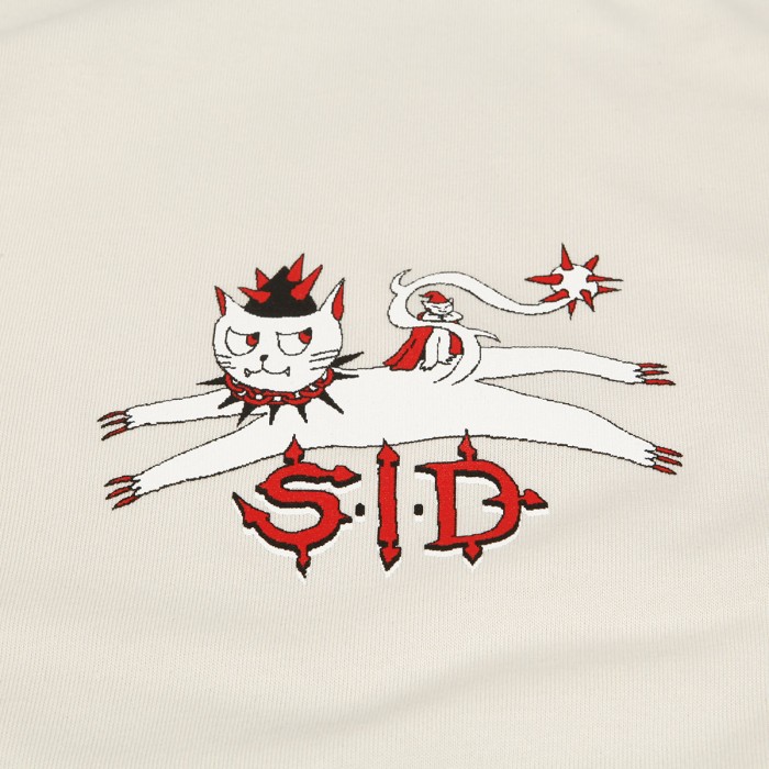 Triko od československé skate značky SID Limited s krátkým rukávem. Model s názvem Cat Tee v bílé barvě slonoviny. Na prsou natištěná kočka se skřítkem a nápisem SID. Grafiku vytvořil Tuan Trieu. Regular střih. Vyrobeno ze 100% organické bavlny s vyšší gramáží, GOTS, Vegan, Fairwear. Produkováno v České Republice, vyrobeno v Portugalsku.