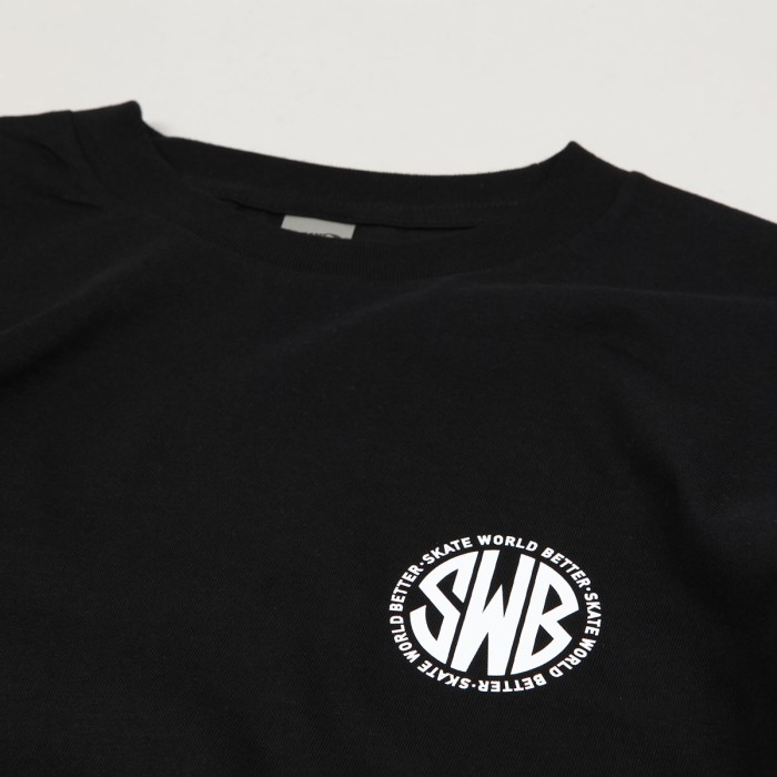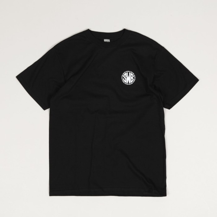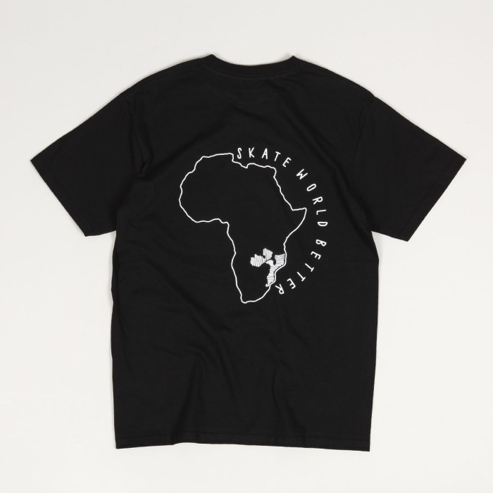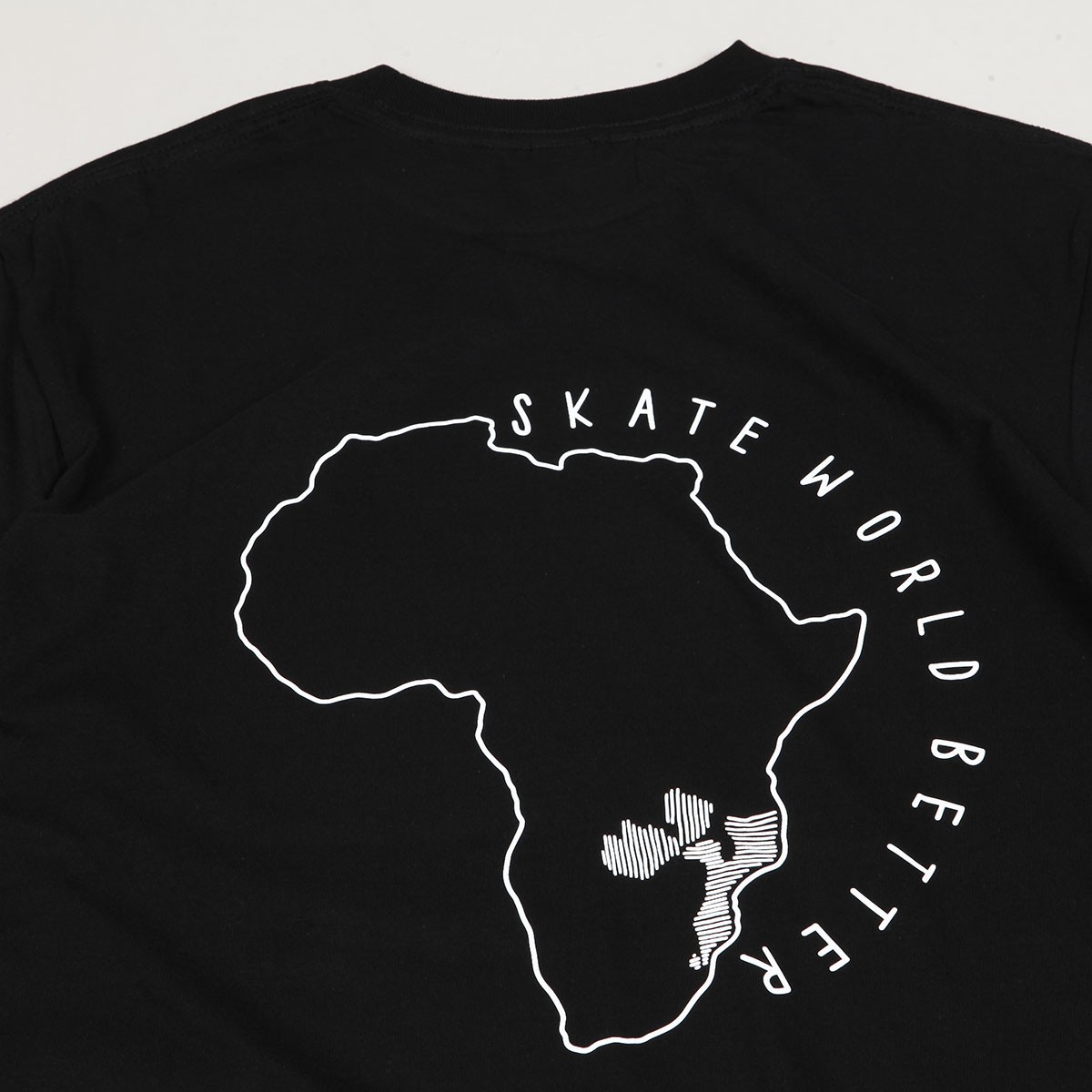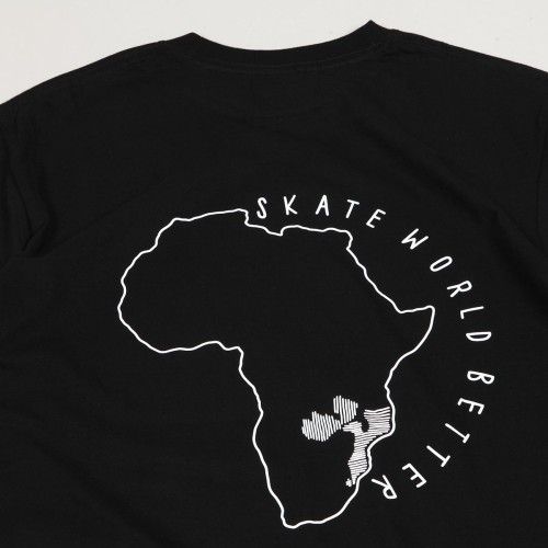 Triko Skate Wolrd Better s názvem ZAM Tee v černé barvě. Na levé straně prsou malý potisk loga SWB a na zádech velká grafika s mapou Afriky a nápisem Skate World Better. Design by @yakokarlik. Vyrobeno ze 100% bavlny, 200 g/m.