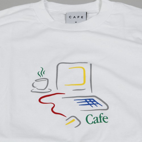 Triko od britské značky Skateboard Cafe, která vznikla společně se stejnojmenným skateboardovým videem v roce 2008. Model Gerald Tee v bílé barvě, na prsou potisk barevného, kresleného počítače. Materiál 100% bavlna.