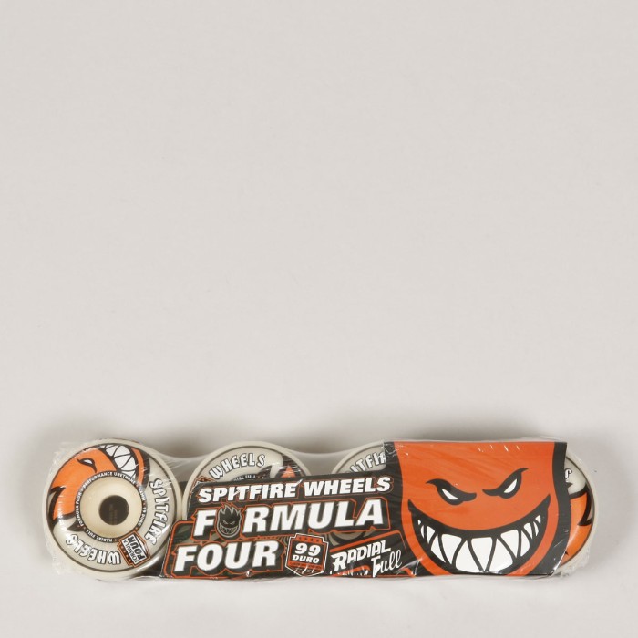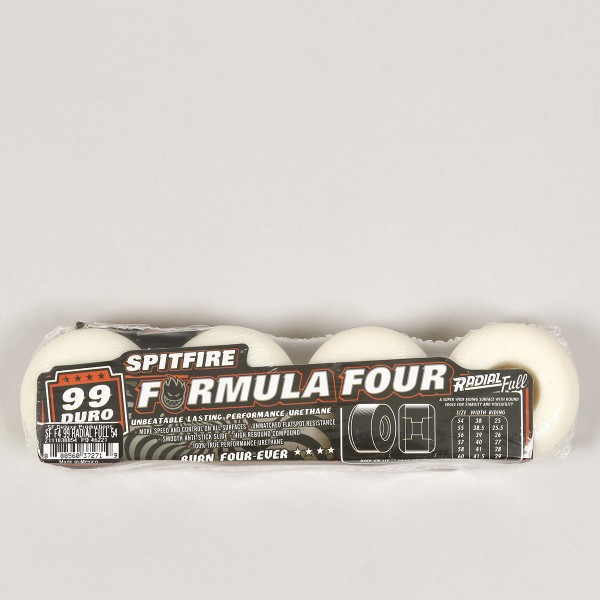 Kolečka z kolekce značky Spitfire Wheels. Model s názvem Formula Four 99 DU Radial Full je nejvyšší řadou koleček od Spitfire. Kombinují vlastnosti pro různé druhy povrchů. Tvrdost 99 DURO má delší životnost, lepší ovladatelnost a zvyšují odraz. Průměr 54 mm, 34 mm. Made in USA.