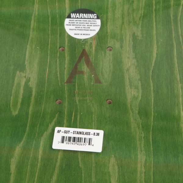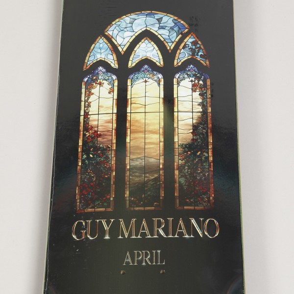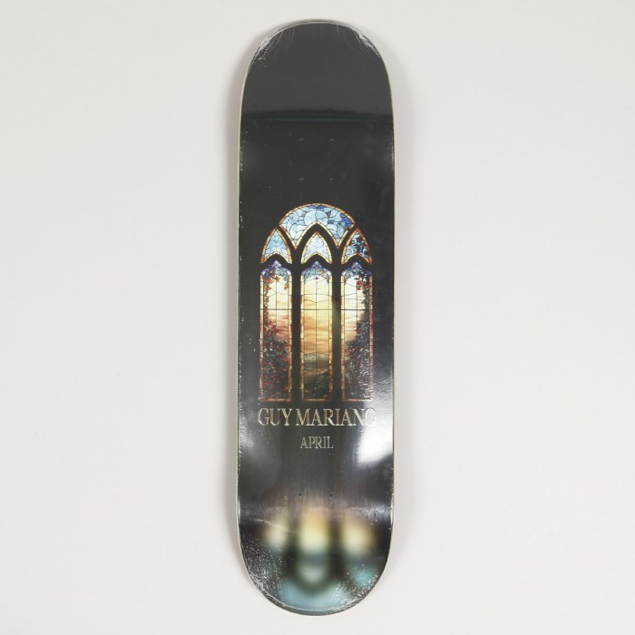 April skateboards skateboard deck , team model called Guy Mariano Stain Glass Deck. Graphic of a large colorful arch stained glass window with the Guy Mariano inscription and the April logo. The size of the deck is 8.38 inches. Free grip with each deck. The colored side of the wooden deck may differ from the photo shown.