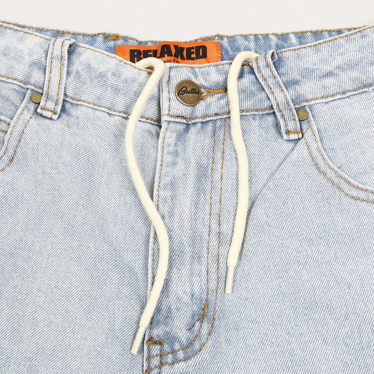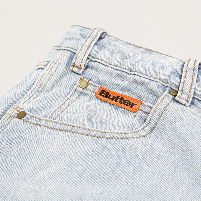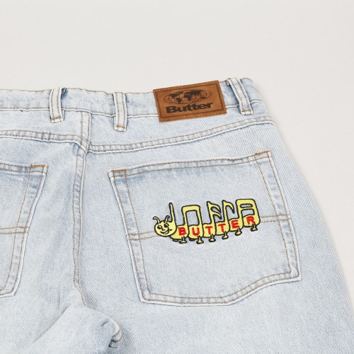Jeans from the collection of the Australian brand Butter Goods , founded in 2008 by skaters and friends Garth Mariano and Matt Evans. The model called Caterpillar Denim Pants in light blue has a loose Relaxed cut. On the right front pocket there is a patch with the brand's logo and on the back pocket there is an embroidered caterpillar made of music notes with the Butter inscription. Hidden drawstring at the waist. On the upper hem on the right side there is a rectangular leather patch with the Butter label embossed.