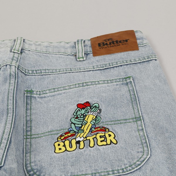 Jeans from the collection of the Australian brand Butter Goods , founded in 2008 by skaters and friends Garth Mariano and Matt Evans. The model called Martian Denim Jeans Pants in light blue has a wide Very Baggy cut and green screening. An alien is embroidered on the front pocket and back pocket. Hidden drawstring at the waist. On the upper hem on the right side there is a rectangular leather patch with an embossed Butter label.