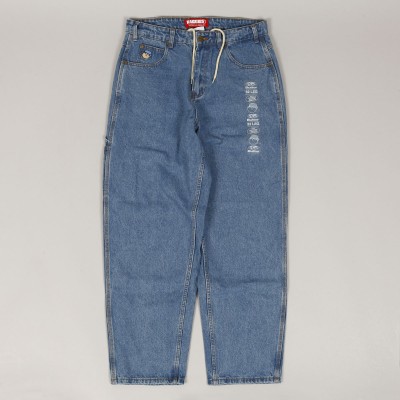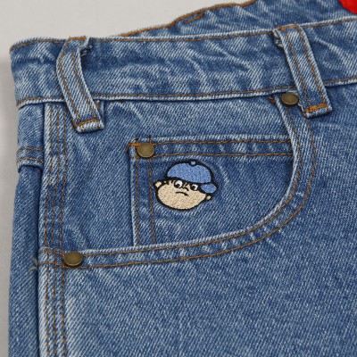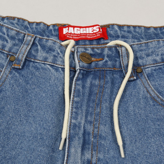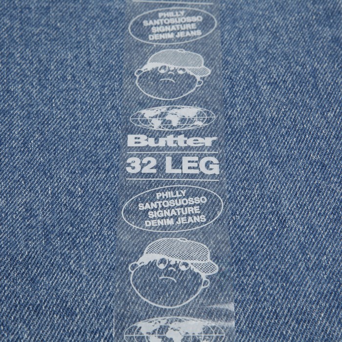 Jeans from the collection of the Australian brand Butter Goods , founded in 2008 by skaters and friends Garth Mariano and Matt Evans. The model called Santosuosso Denim Pants in washed blue has the widest Baggiest, straight cut. On the right front pocket there is an embroidered boy's face and on the back pocket there is a patch with the brand's logo. Hidden drawstring at the waist. On the upper hem on the right side there is a rectangular leather patch with the embossed Butter label.