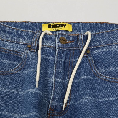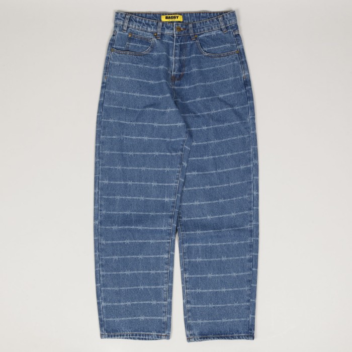 Jeans from the collection of the Australian brand Butter Goods , which was founded in 2008 by skaters and friends Garth Mariano and Matt Evans. The model called Barbwire Denim Jean Pants in washed blue has a wide Very Baggy Fit, straight cut. All-over barbed wire motif and a discreet brand flag on the back pocket . Hidden drawstring at the waist. Rectangular leather patch with embossed Butter label on the upper hem on the right side.
