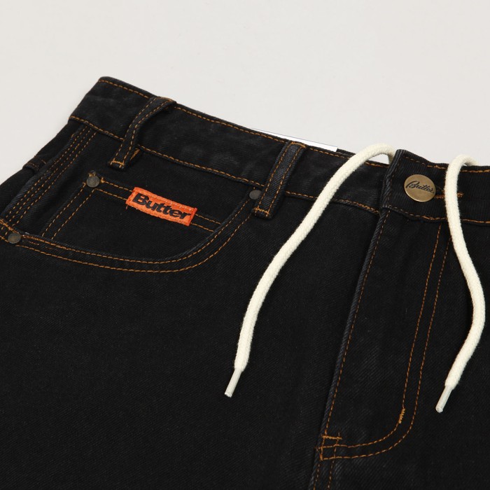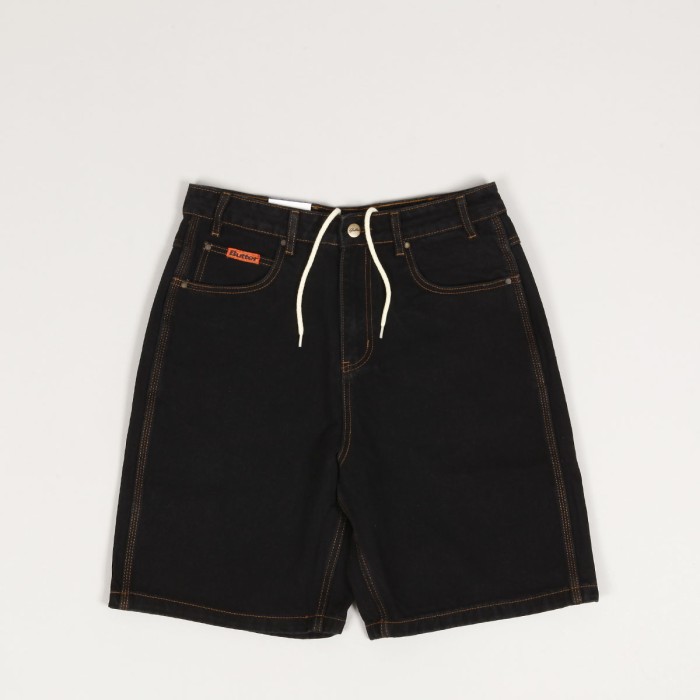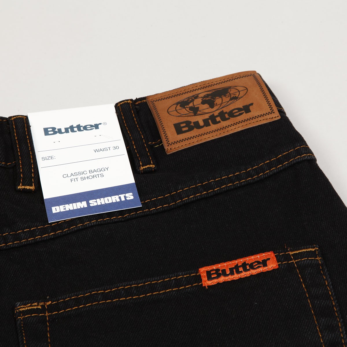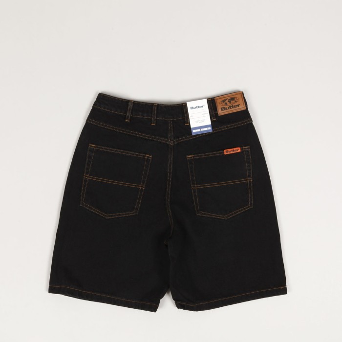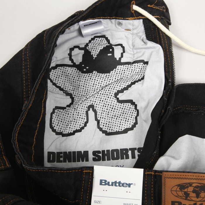 Jean shorts from the collection of the Australian brand Butter Goods , founded in 2008 by skaters and friends Garth Mariano and Matt Evans. The model called Baggy Denim Shorts in washed black has a wide Baggy cut. Hidden drawstring inside the waist. Subtle Butter flag on the right front and right back pocket. Rectangular leather patch with embossed Butter label on the upper hem on the right side.