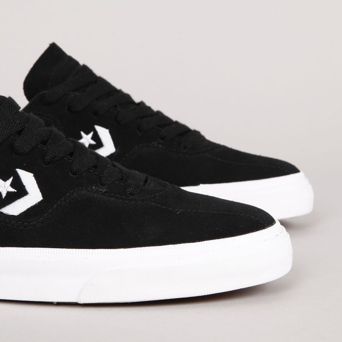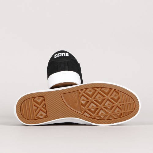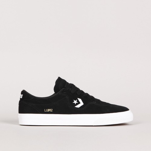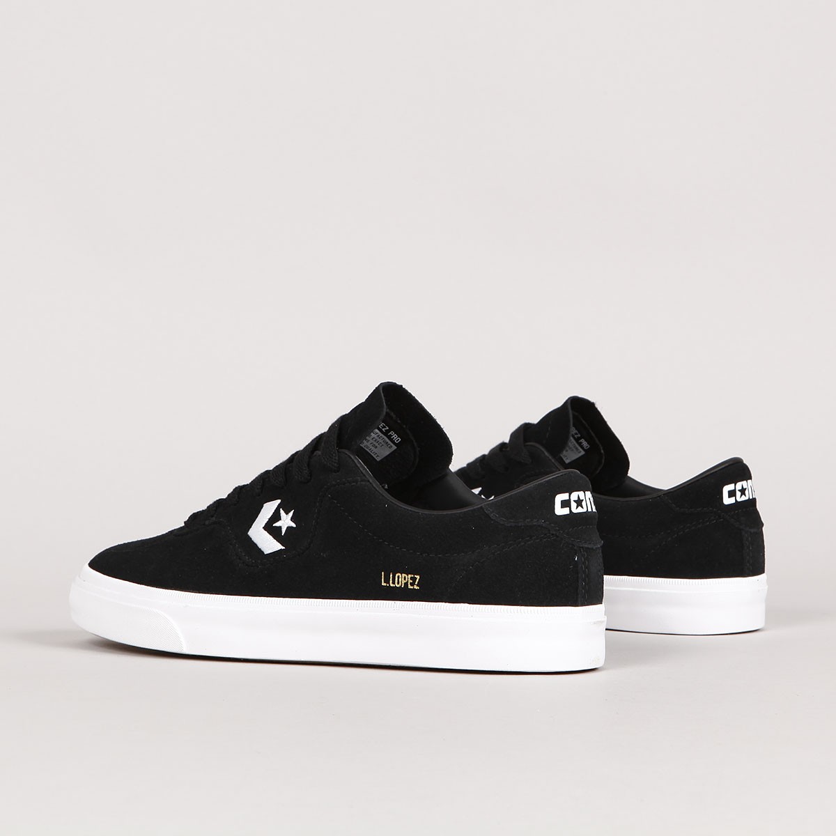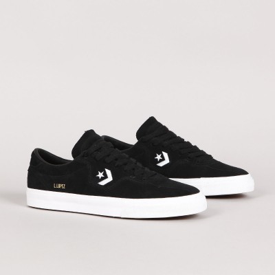 Converse CONS shoes . Pro-model Louie Lopez Pro in black suede and a volcanic sole. Clean, long toe with subtle stitching and a leather inner heel, which will also extend its life. A white contrasting Star Chevron logo is sewn on the side of the shoe. Padded hem around the ankle, durable toe and inner foam insert for softer impacts and greater comfort. Gold L. Lopez inscription on the outside of the shoes. The Converse CONS logo is embossed on the perforated tongue.