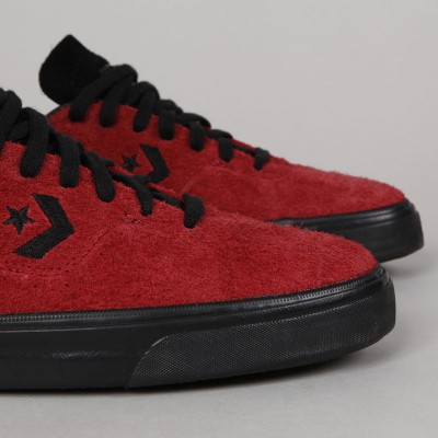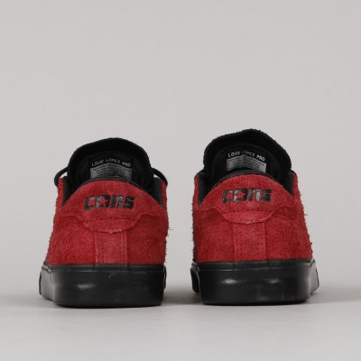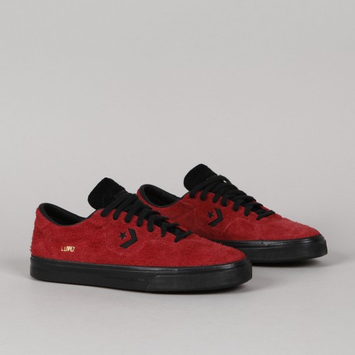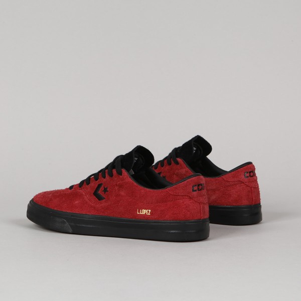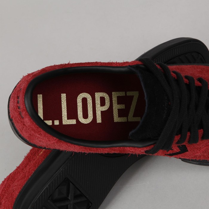 Converse CONS shoes . Pro-model Louie Lopez Pro in brick suede (shaggy suede) and black volcanic sole. Clean, long toe with subtle stitching and leather inner heel, which will also extend its life. On the side of the shoe is embroidered black contrasting Star Chevron logo. Padded hem around the ankle, durable toe and inner sole with Nike Zoom Air technology for softer impacts and greater comfort. Gold L. Lopez inscription on the outside of the shoes. The Converse CONS logo is embossed on the perforated tongue. One insole with LOPEZ signature and the other with the CONS logo.