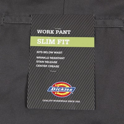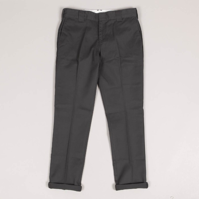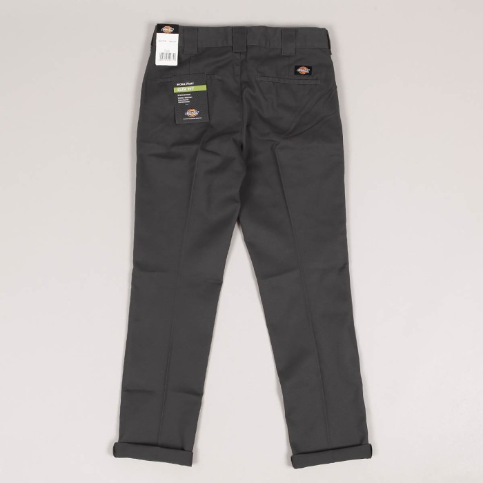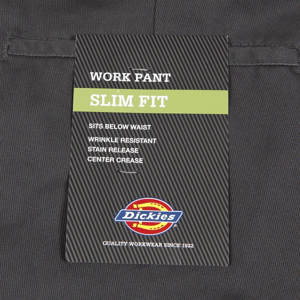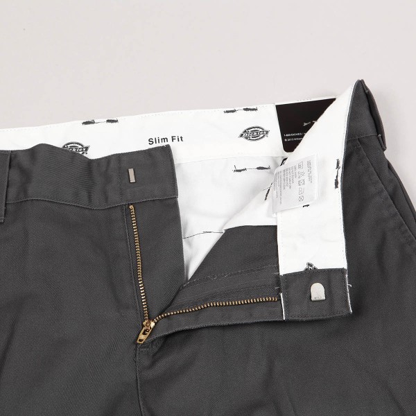 Dickies pants called 872 Work Pants in dark gray. Two front and two back pockets for small items. Patch with the Dikies logo on the back. Button closure. Ideal for skateboarding and casual wear. Material 65% polyester and 35% cotton. Slim Fit cut.