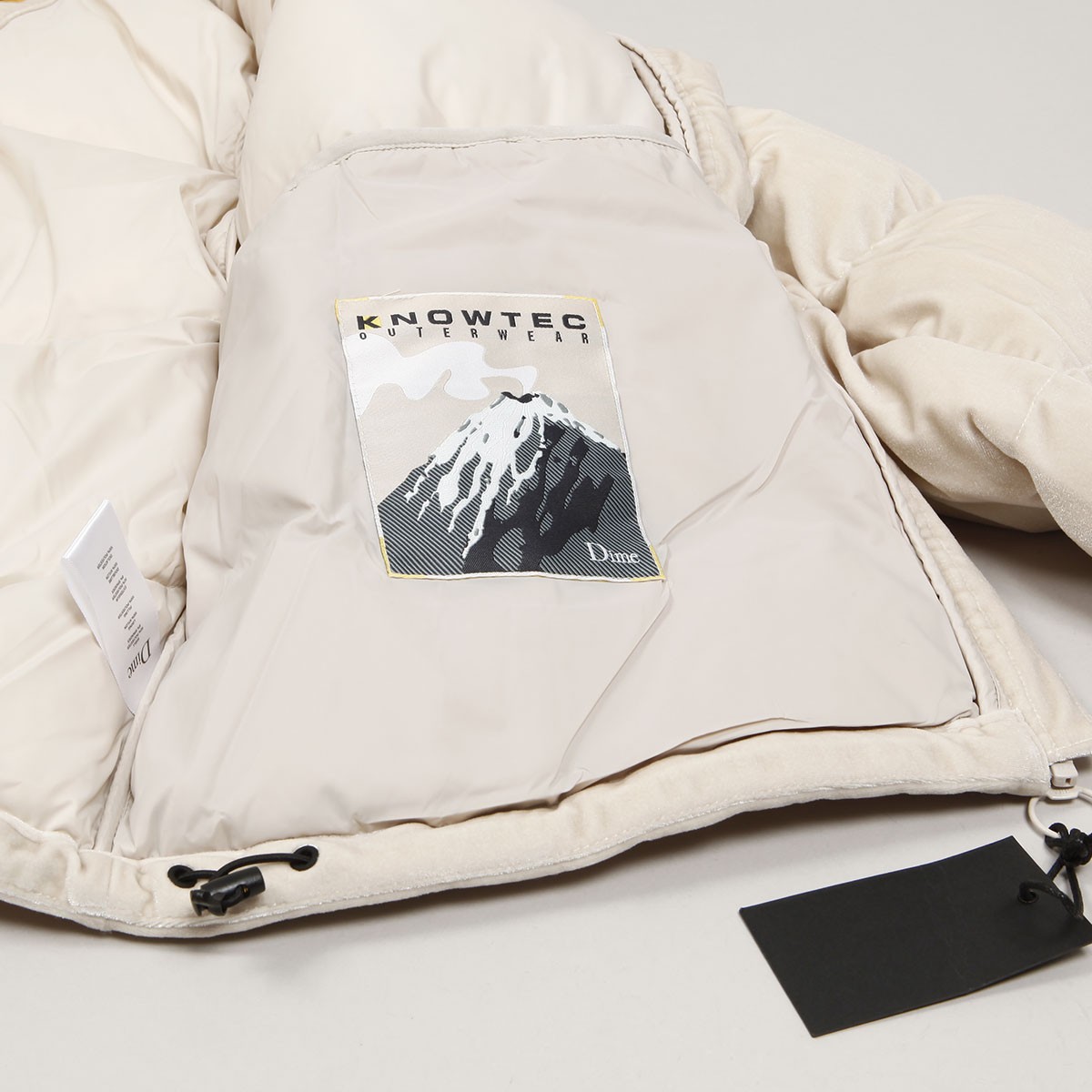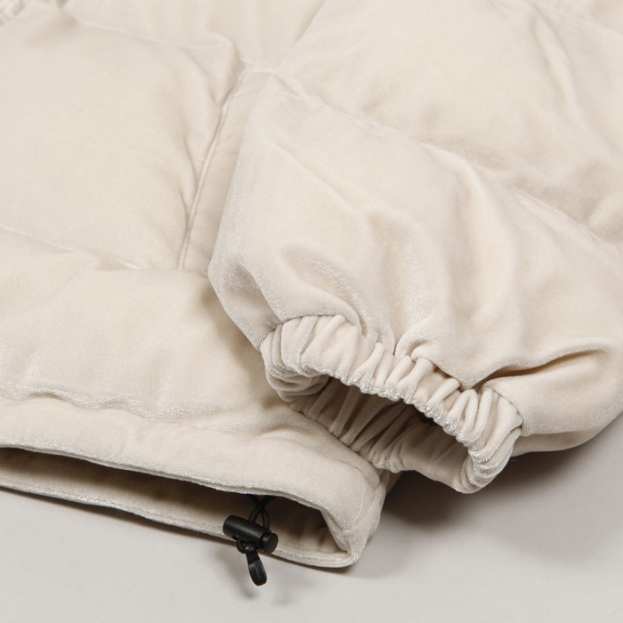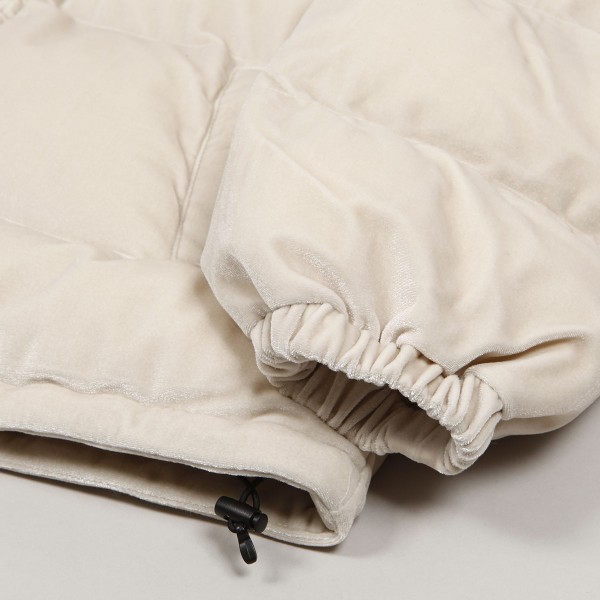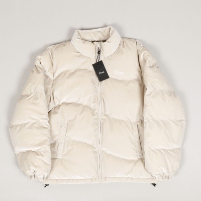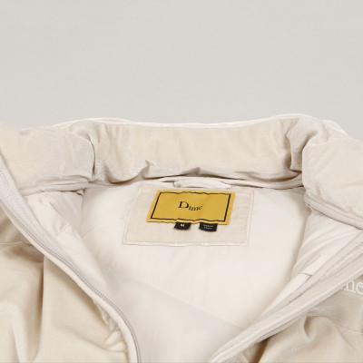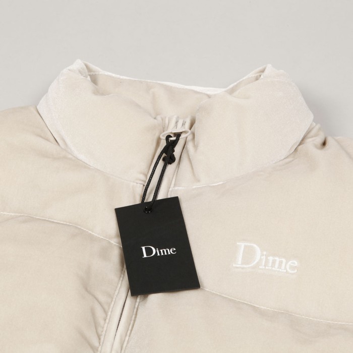 Dime Velvet Quilted Puffer Jacket in beige. Subtle Dime logo embroidered on the left chest. Full-surface wavy stitching. Soft velvet upper, Loftech insulation inside. YKK zipper closure, two front pockets. Elastic cuffs and waist. Material 95% polyester and 5% spandex.