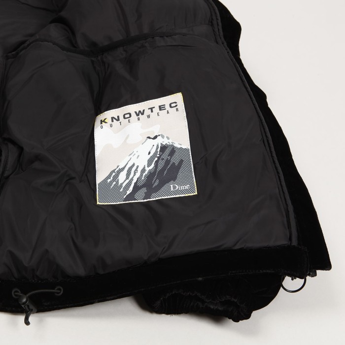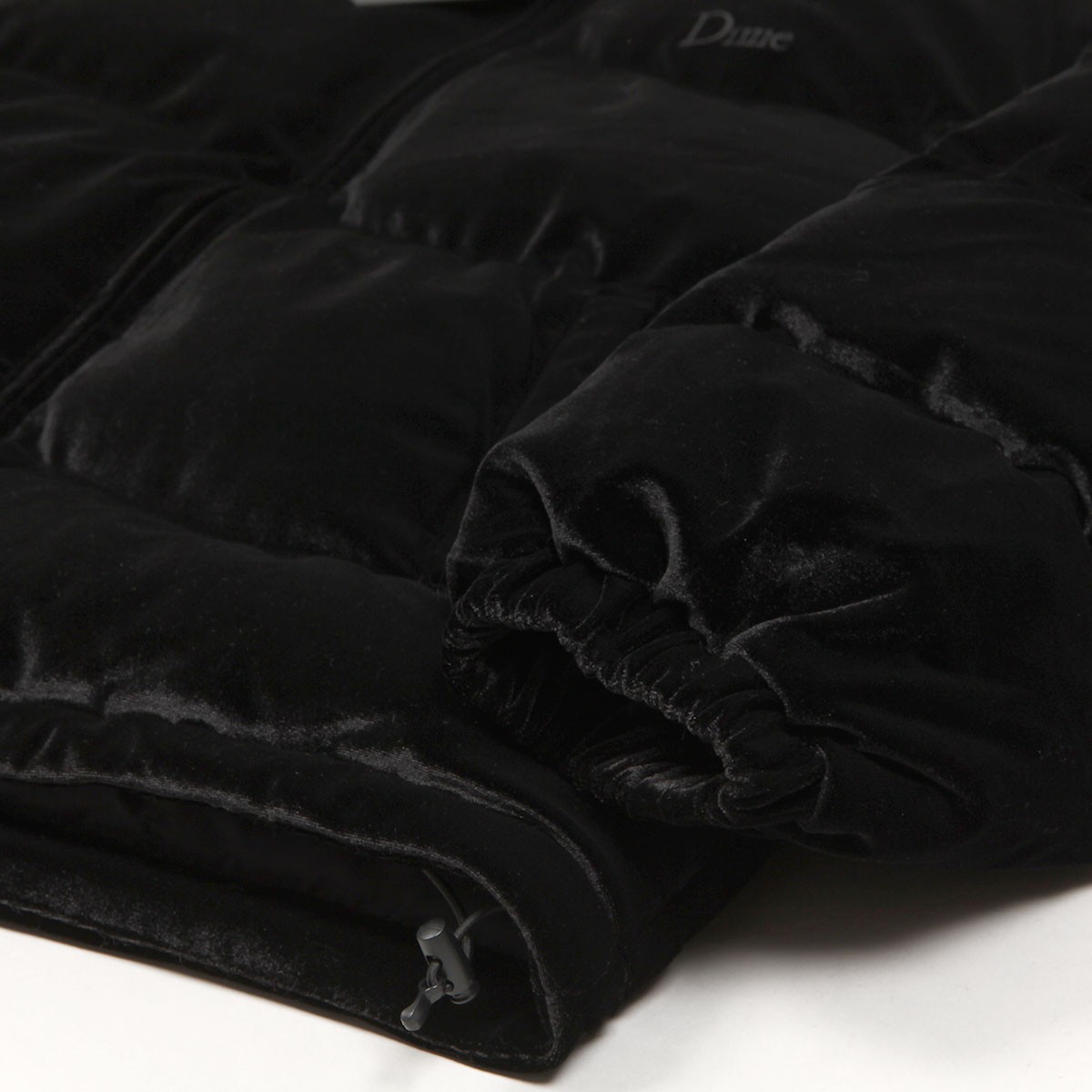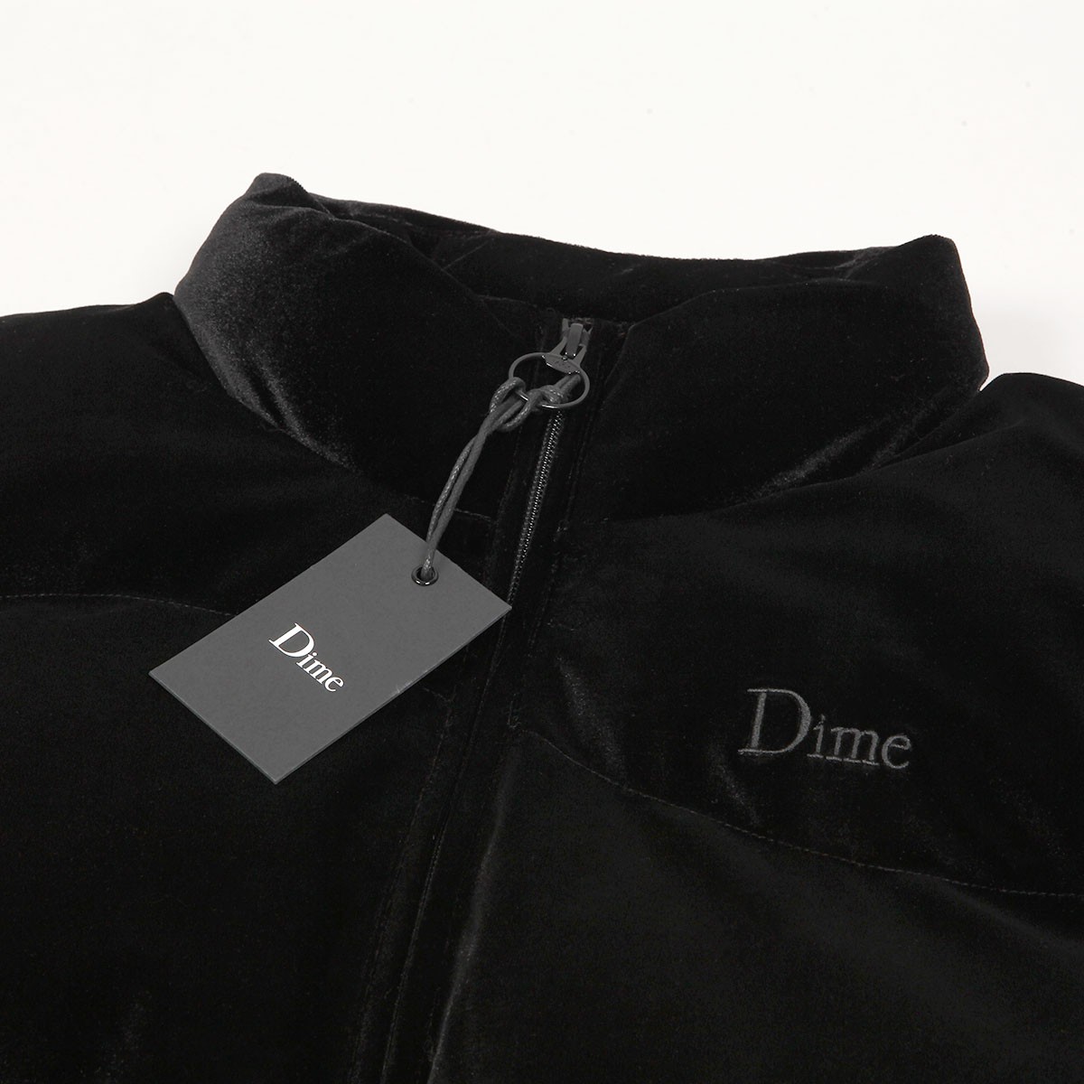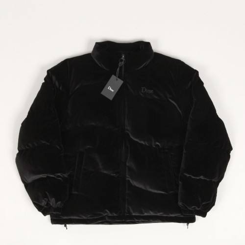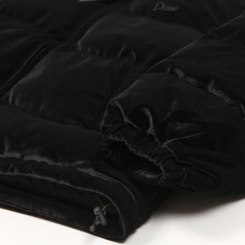 Dime Velvet Quilted Puffer Jacket in black. Subtle Dime logo embroidered on the left chest. Full-surface wavy stitching. Soft velvet upper, Loftech insulation inside. YKK zipper closure, two front pockets. Elastic cuffs and waist. Material 95% polyester and 5% spandex.