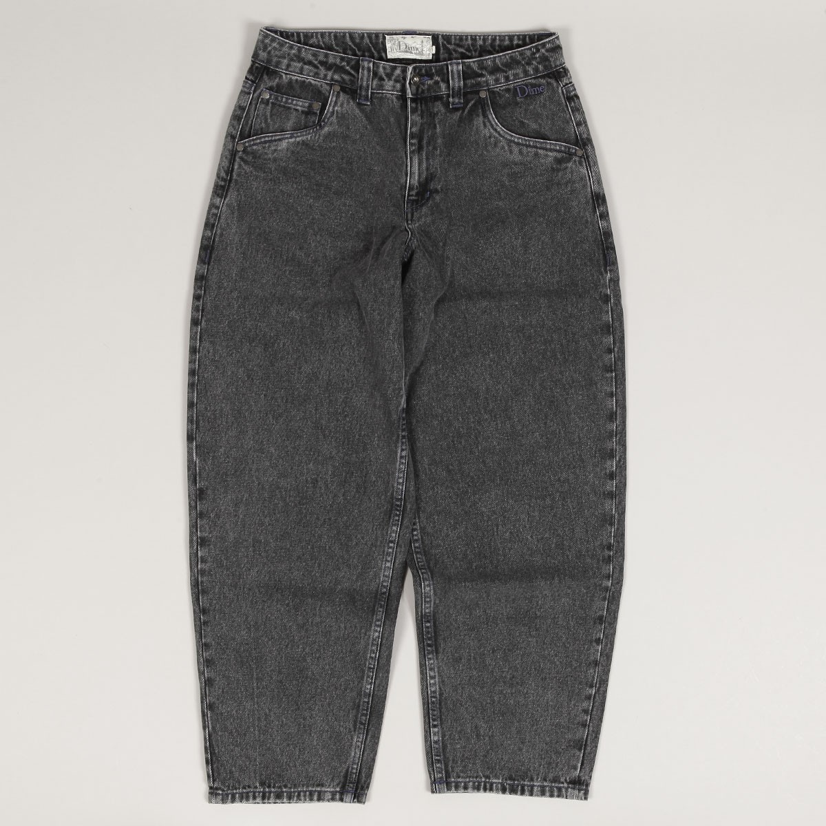 Dime jeans called Classic Baggy Denim Pants in faded black. Dime embroidery on the front left pocket. Dime label embroidered on the waist. Button and YKK zipper closure. Loose wide cut - Baggy fit. Material 100% cotton.