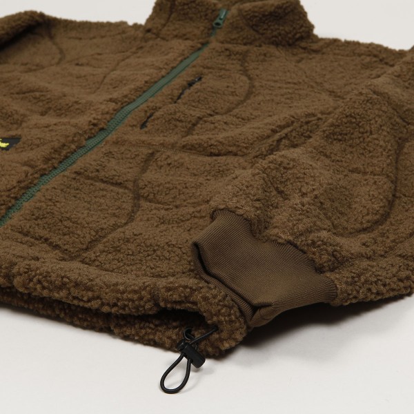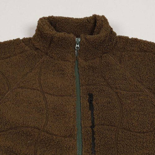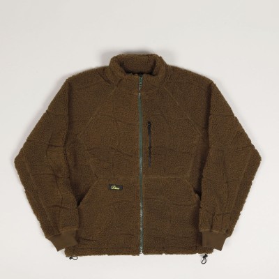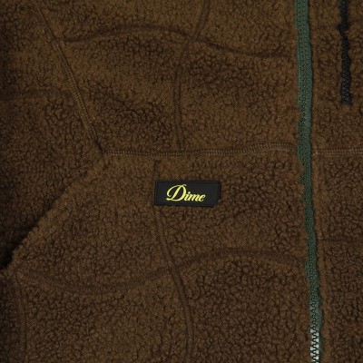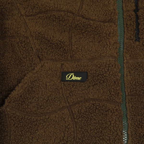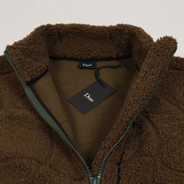 Dime's furry fleece sweatshirt called Coverstich Sherpa Fleece Crewneck in dark brown. Subtle Dime logo patch on the right side. All-over wave motif. High collar and YKK zipper closure. One zipper pocket on the chest and two hidden kangaroo pockets on the stomach. Ribbed, elastic sleeve ends and elasticated waist. Material 100% polyester.
