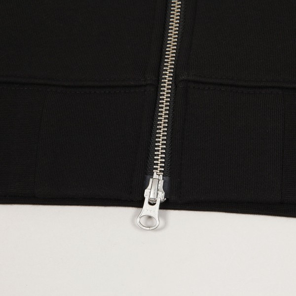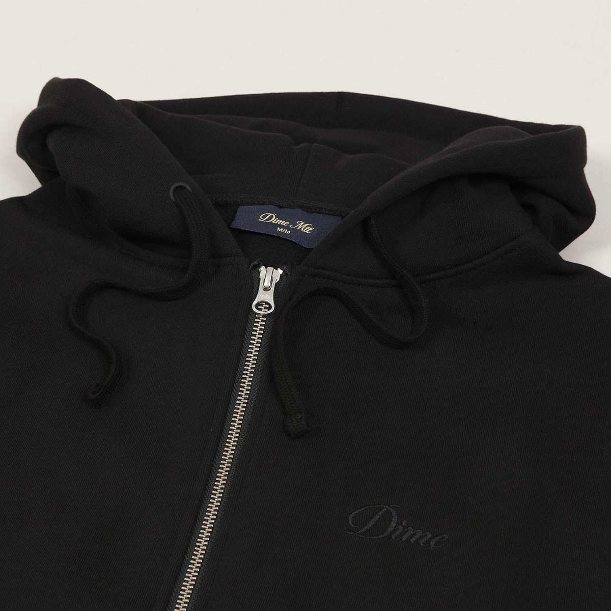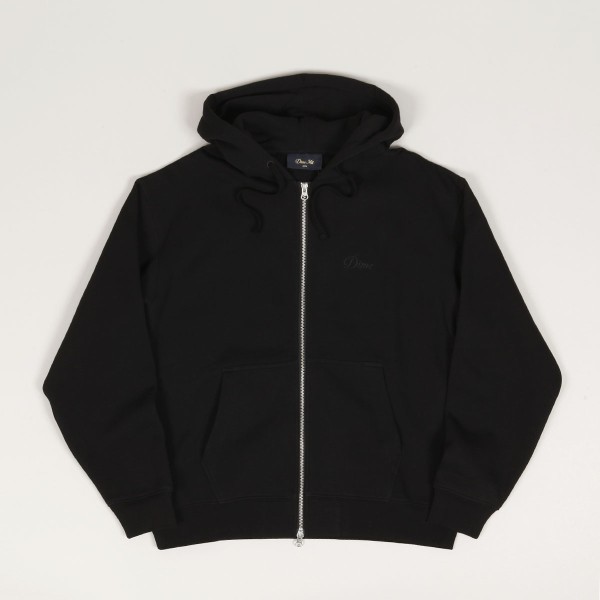 Dime Cursive Zip Hoodie in black. Contrasting Dime logo embroidered on the left chest. Hood and large front pocket. Two-way zip fastening. Ribbed, elasticated cuffs and waist. Material 75% mid-weight cotton and 25% polyester.