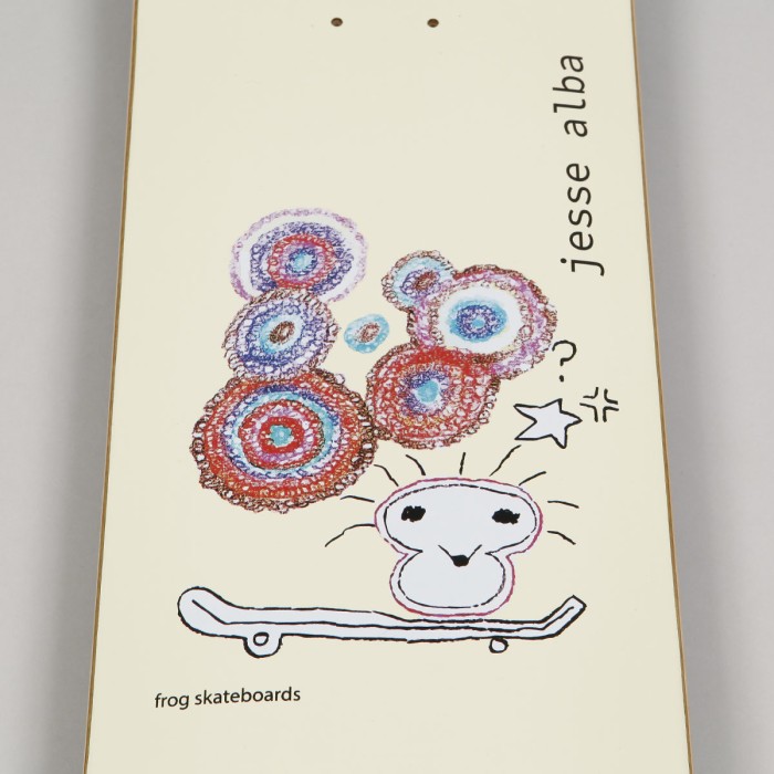 Frog Skateboards skateboard deck, pro model of rider Jesse Alba. Model called Jess Alba Deck, graphics of a small cartoon character on a skateboard and the Frog Skateboards inscription. Size 8.6 inches. The top colored side of the board may differ from the photo. Free grip with each board.