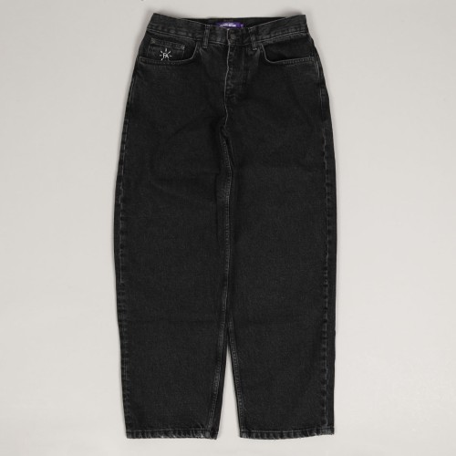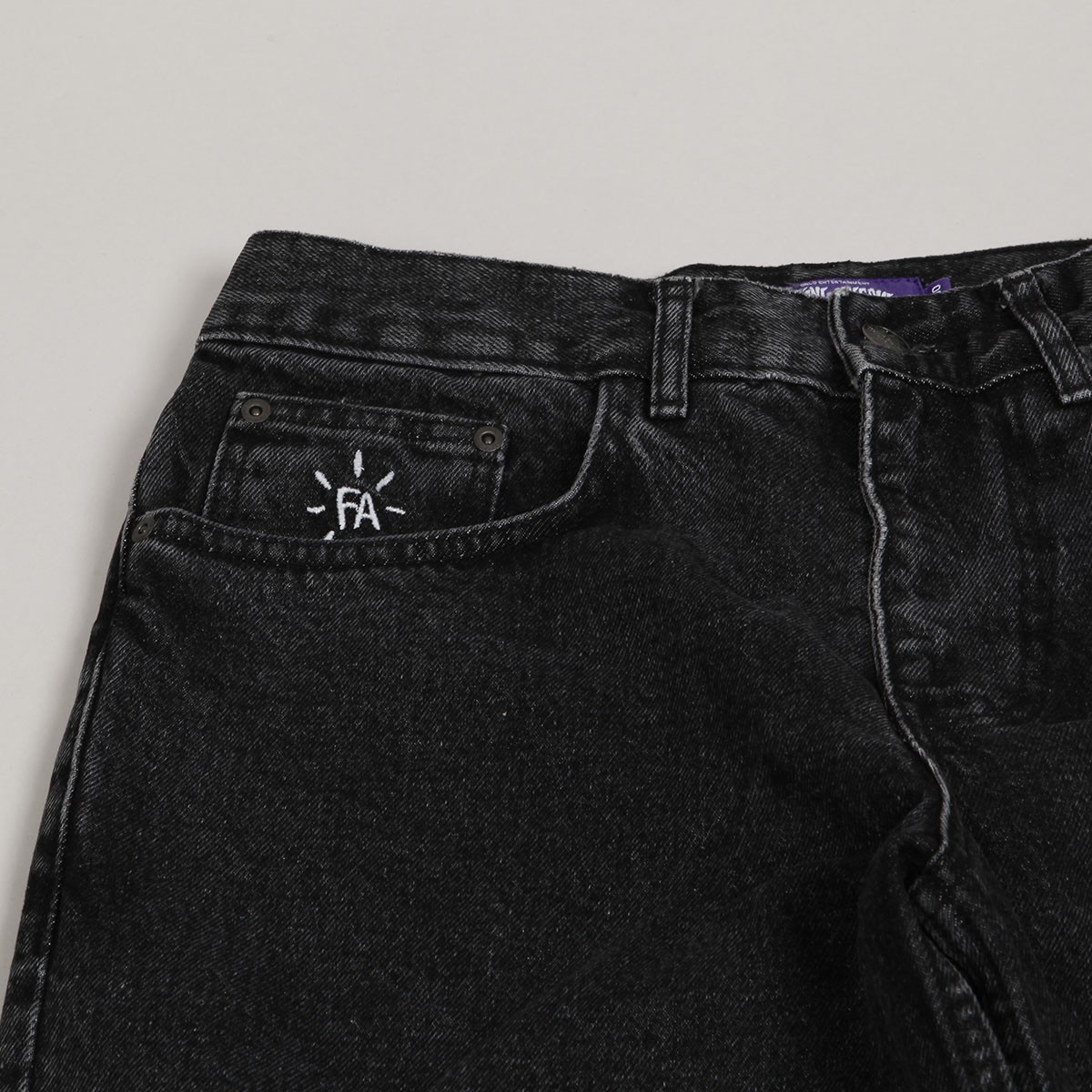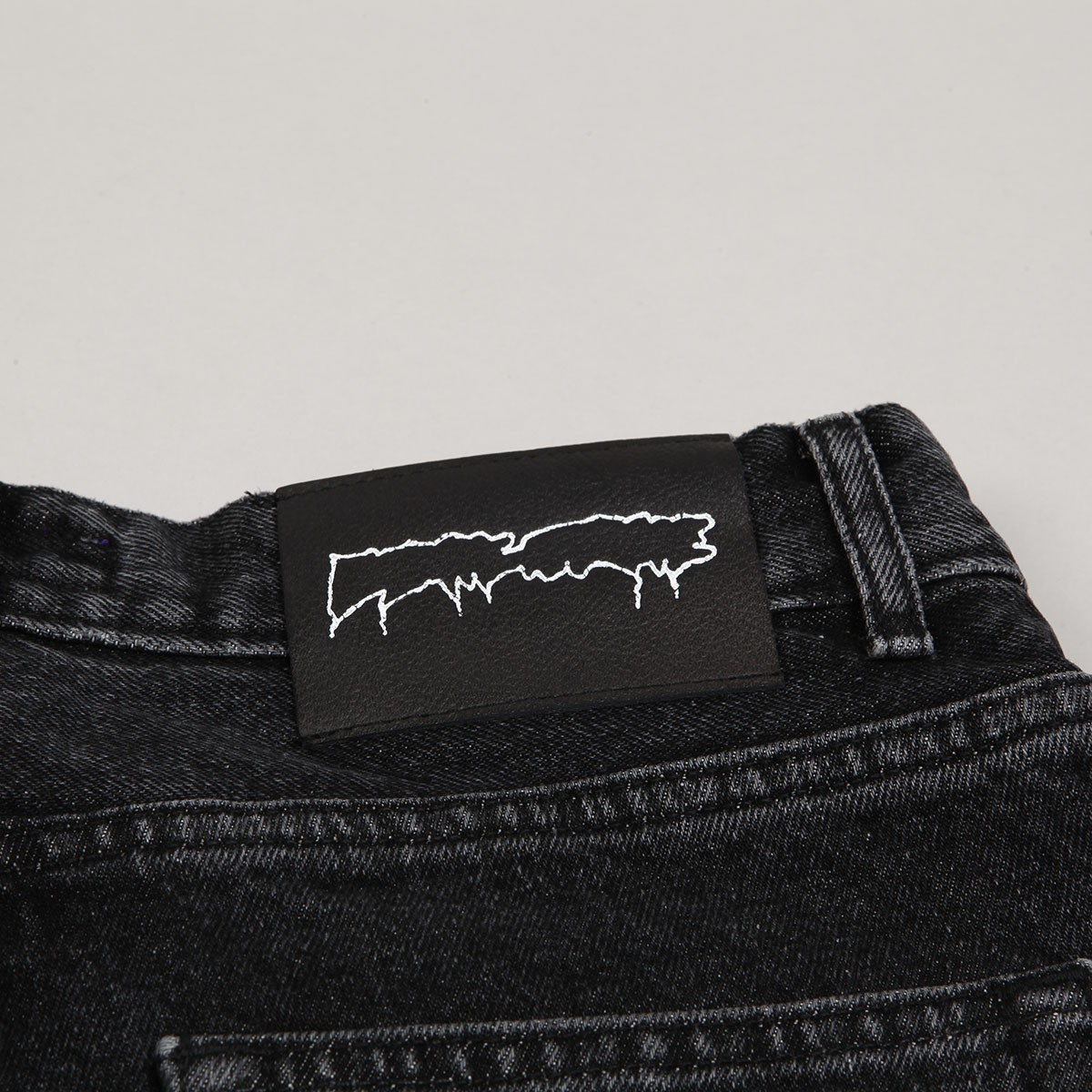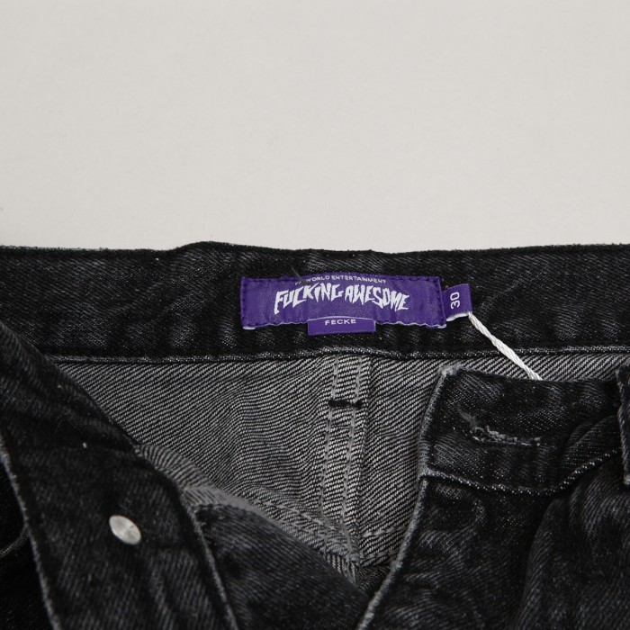 Fucking Awesome jeans, designed by skateboarders Jason Dill and Anthony Van Engelen. Model called Fecke Jean Pants in washed black. Waist with button and hidden zipper, two front pockets and a back pocket for small items. FA embroidered on the front right pocket and a leather label with the Fucking Awesome inscription on the back hem. Baggy fit - wide.