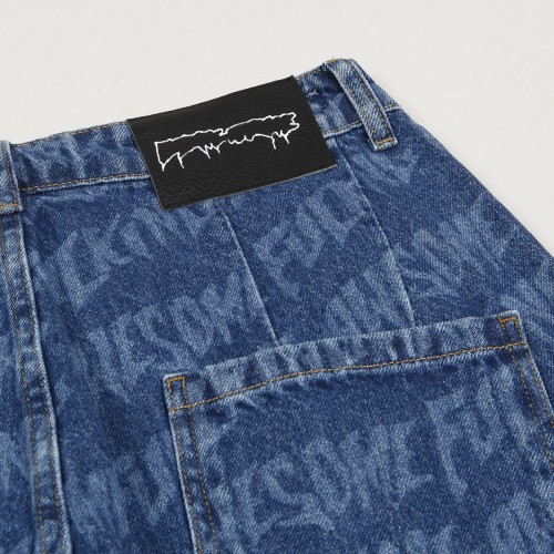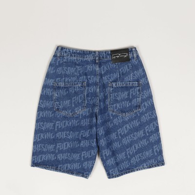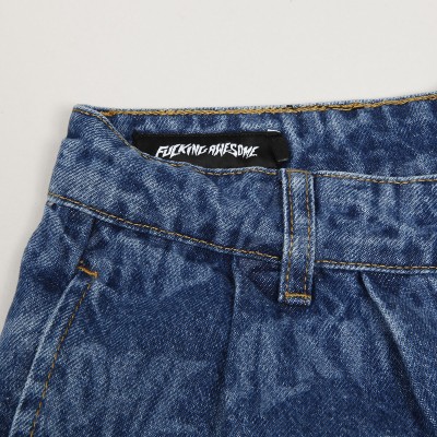 Fucking Awesome shorts from the collection by skateboarders Jason Dill and Anthony Van Engelen. The model called Baggy Pleated Denim Laser Stamp Shorts in blue has an all-over, laser-burned print of the inscription Fucking awesome. Button fastening with the FA logo, zip flap, two front and two back pockets for small items. Leather label with the outline of the Fucking Awesome logo on the back hem. Material 100% cotton.