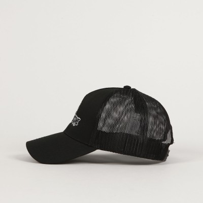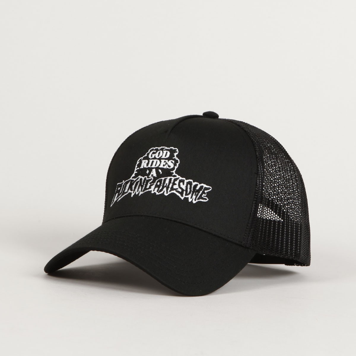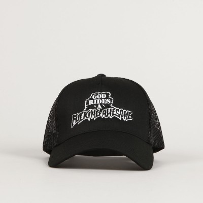 Fucking Awesome cap called God Rides FA Trucker Cap in black . On the forehead it has an embroidered contrasting inscription God Rides and Fucking Awesome . Classic trucker cut, two front panels with ventilation eyelets, the rest mesh. In the back there is a plastic strap for changing the size. Made of 100% polyester.