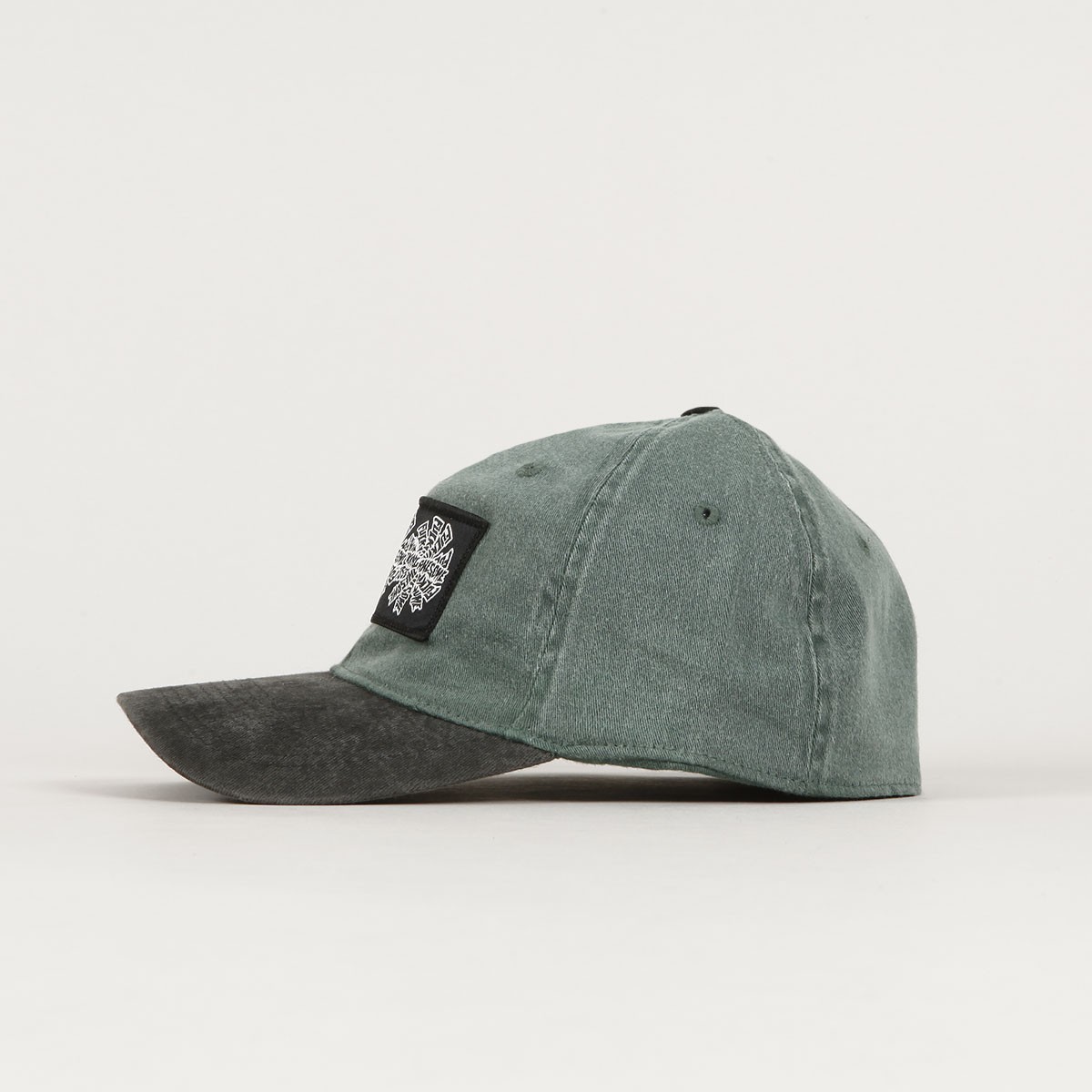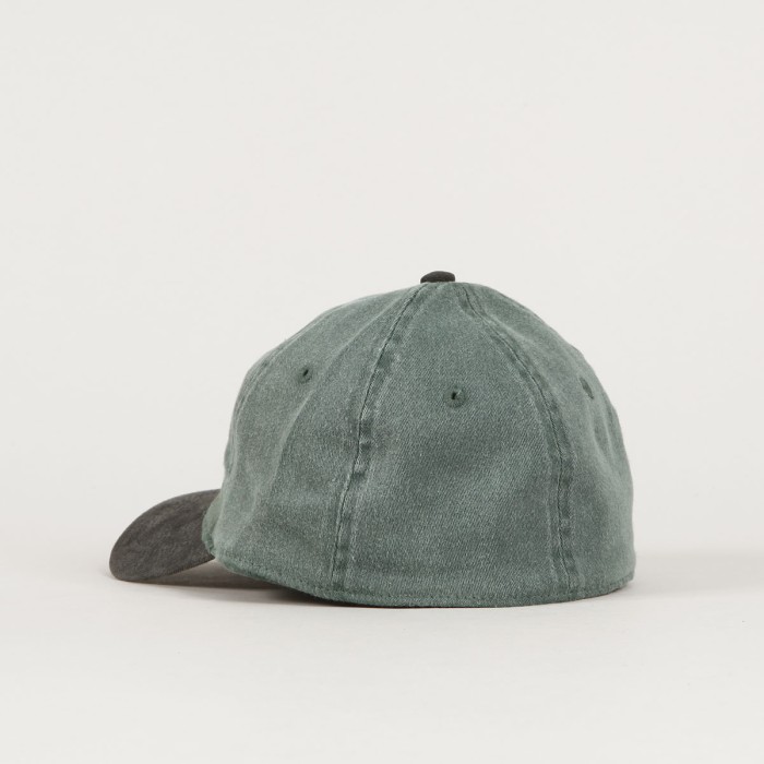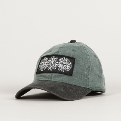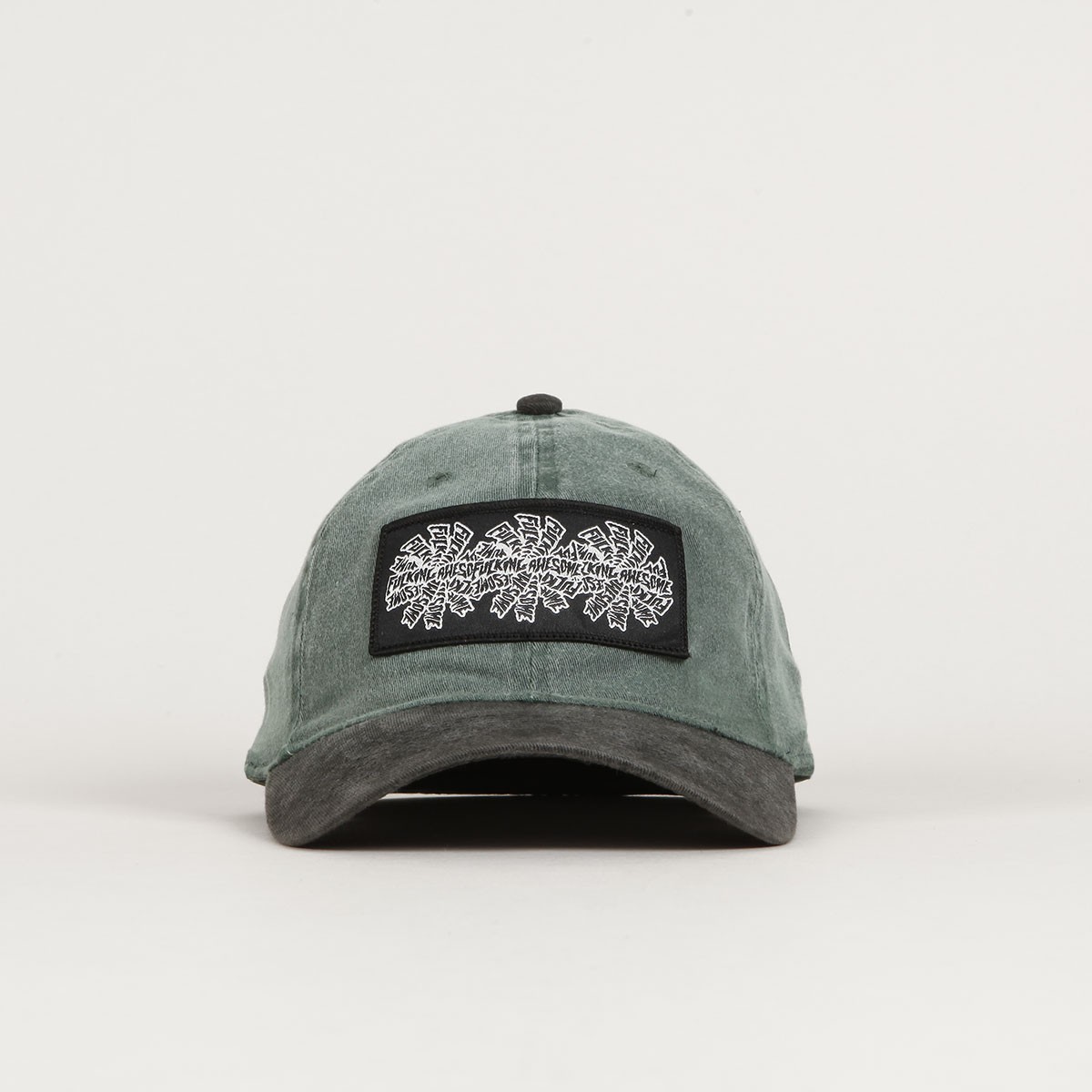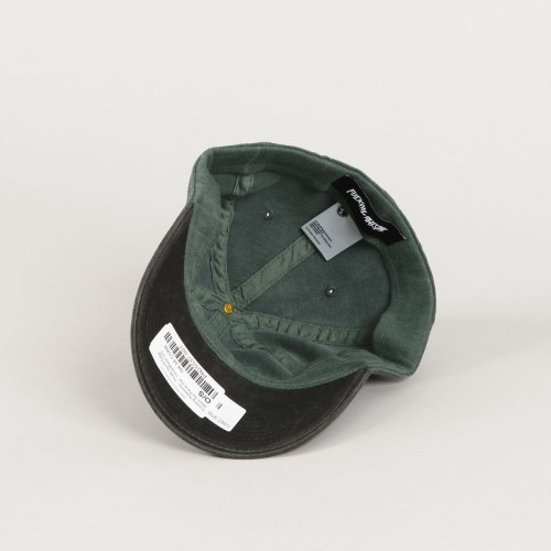 Fucking Awesome cap called Three Spiral Edge Stitch Six Panel Cap in a combination of olive and black colors. It has a patch of the Fucking Awesome triple spiral logo on the forehead. Classic 6-panel cut with a ventilation eyelet on each panel. Flexfit size - stretch rubber around the perimeter of the cap. Made of washed denim.