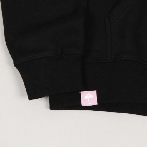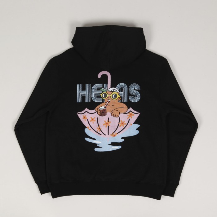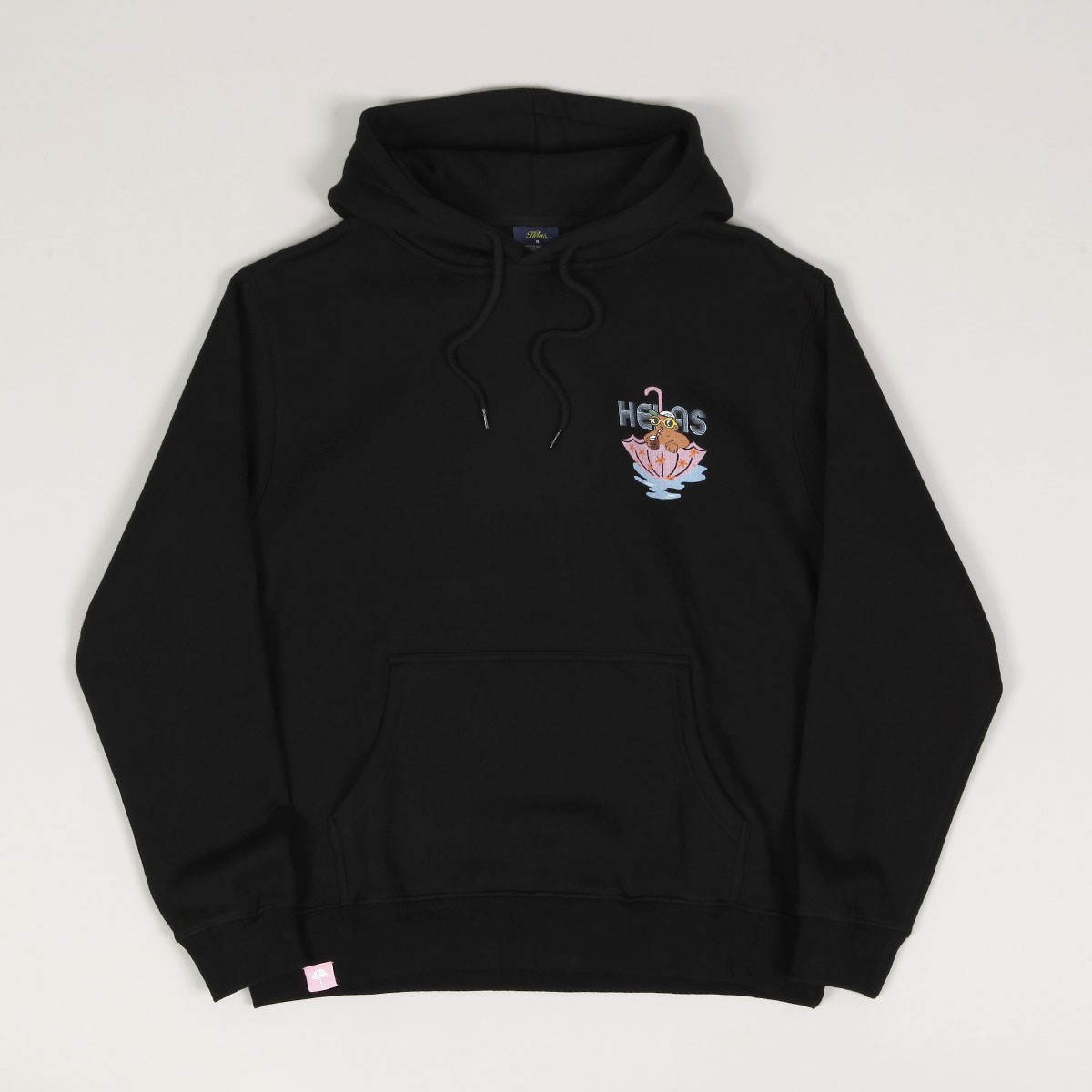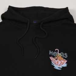 Hélas sweatshirt from the French brand founded by skater Lucas Puig and also run by Roman Lišivka and Marek Zápražný. The Buoy Hoodie model has a drawstring hood and a large hand pocket in the front. On the left chest there is a small graphic of a figure floating in an umbrella and the inscription Hélas, and on the back there is a large graphic. A small patch on the lower hem and metal ends of the laces with the inscription Hélas embossed. Material 100% cotton, fleece inside.