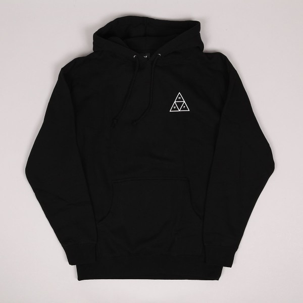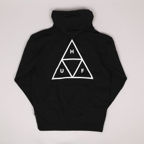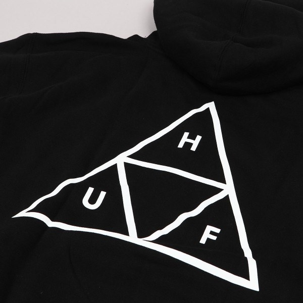 HUF Hooded Sweatshirt Triple Triangle in black has a small HUF logo on the chest and a large one on the back. Removable hood and large front hand pocket. Material 80% cotton, 20% polyester, fleece lining.