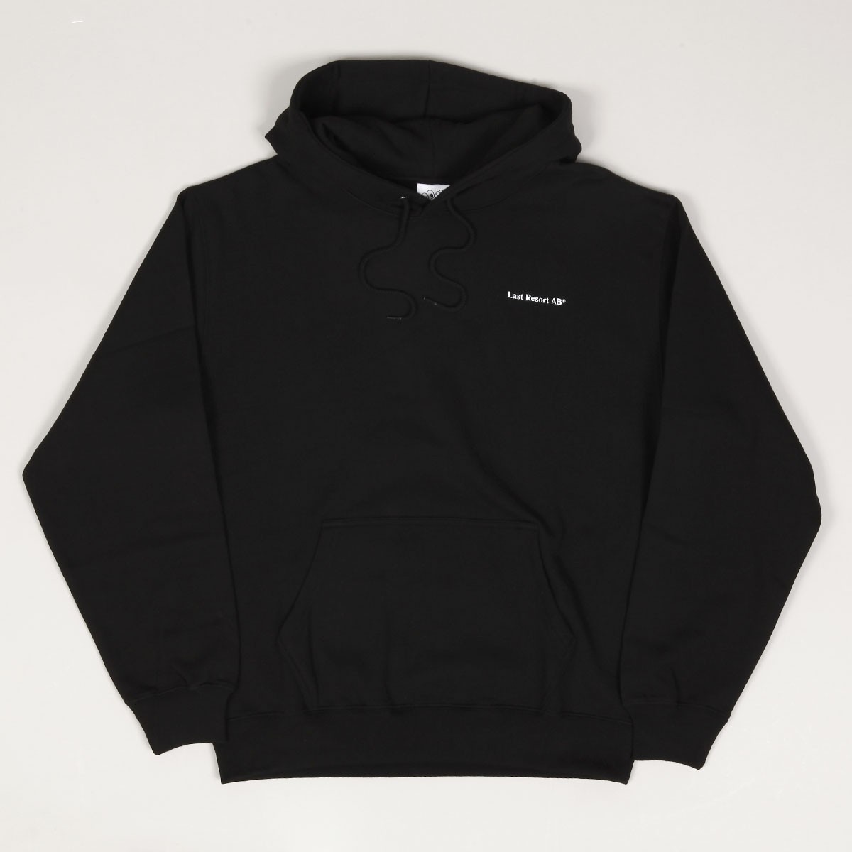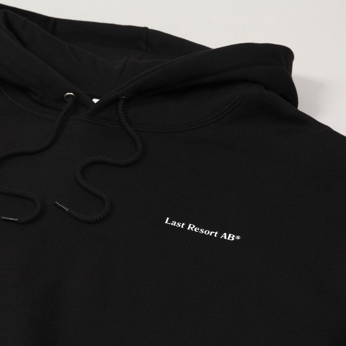 Last Resort AB sweatshirt, model called Atlas Monogram Hoodie in black. Hood with drawstring, large kangaroo pocket in front. Small inscription on the left chest and large Last Resort AB logo on the back. Material 100% cotton, 350 gsm. Last Resort AB is a new brand founded by Pontus Alva and Sami Tolppi, which focuses on the production of skate shoes.