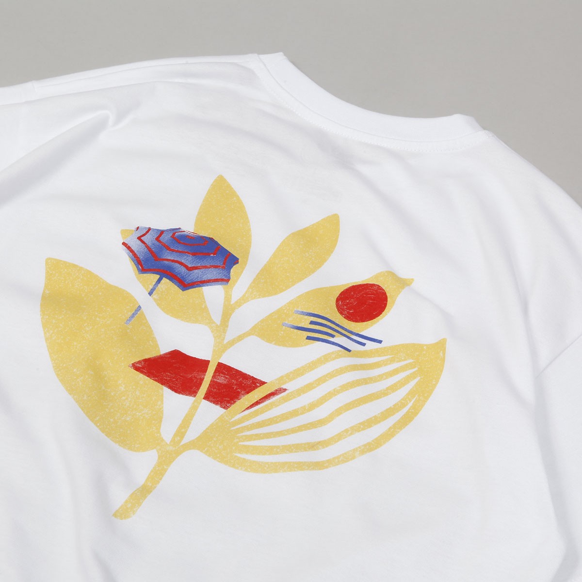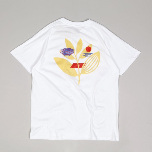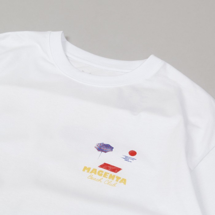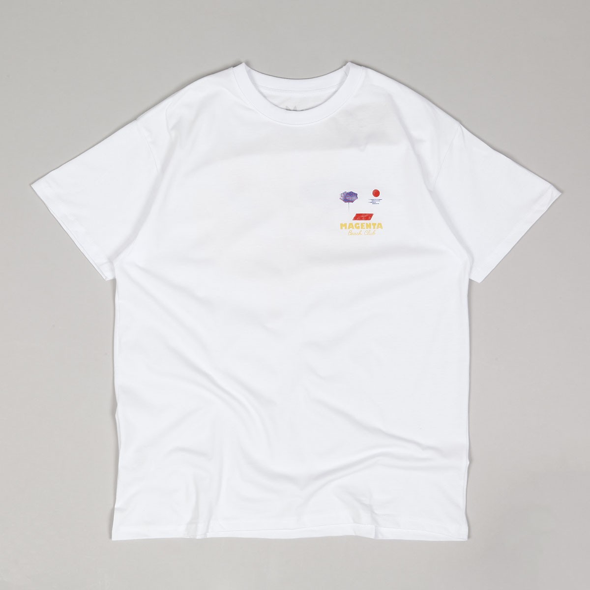 Magenta Skateboards T-shirt , model called Beach Club Tee in white with short sleeves. Small discreet print of the Magenta Skateboards logo on the chest and a large print on the back in the form of a beach. Made of 100% cotton, 180 gsm.