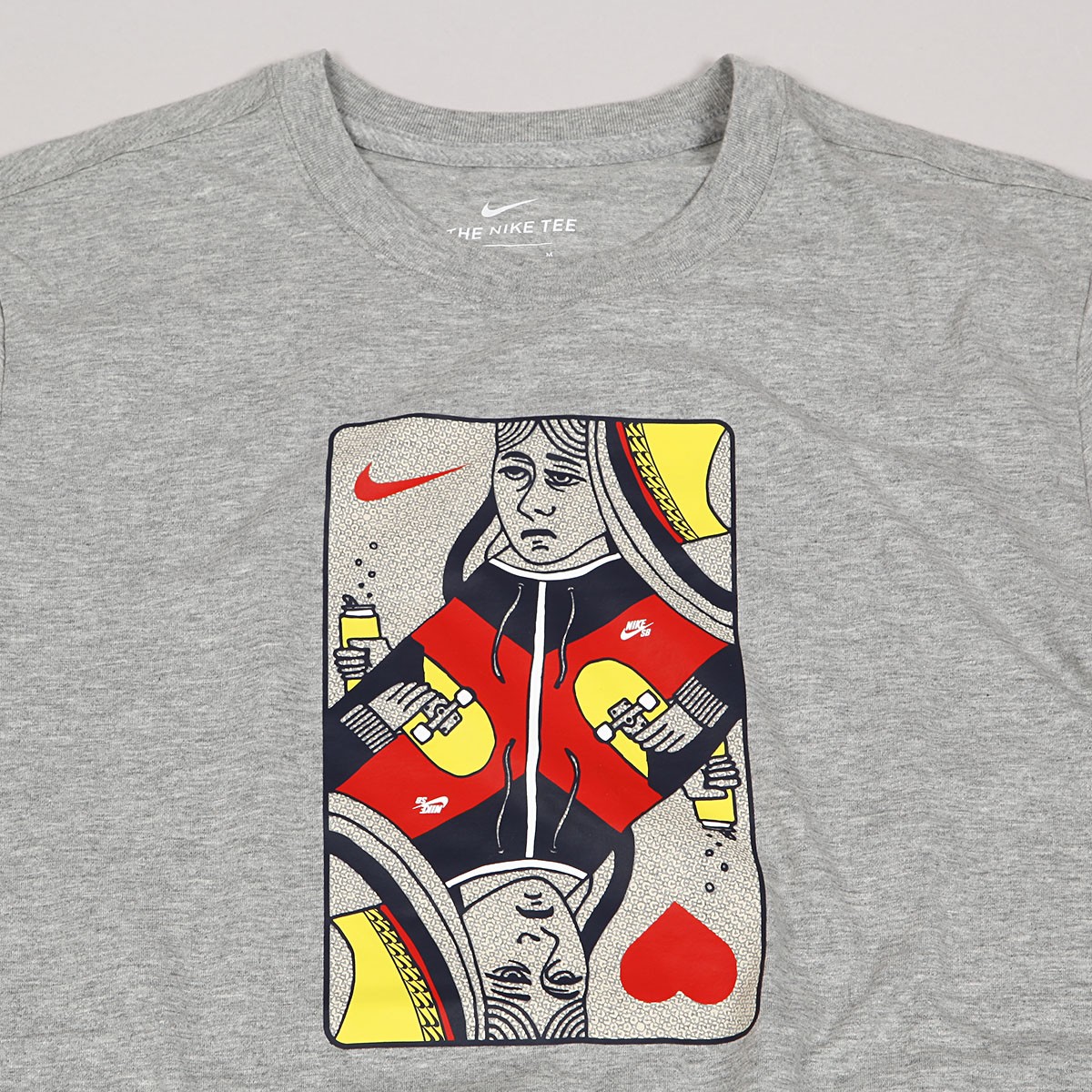 The Nike SB Queen Card Tee in grey from the Nike SB collection is made of pure 100% cotton. T-shirt with a round neckline and ribbed trim around the neck with a sewn-in inner tape and short sleeves. A large image of the Queen of Hearts with a skateboard and a can of beer in her hands is printed on the chest. There is a subtle flag with the brand logo on the left lower hem.