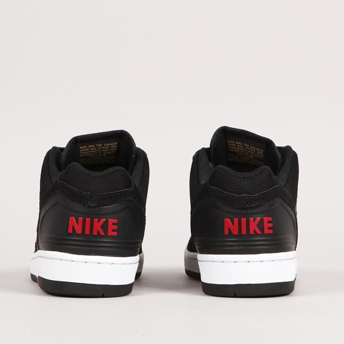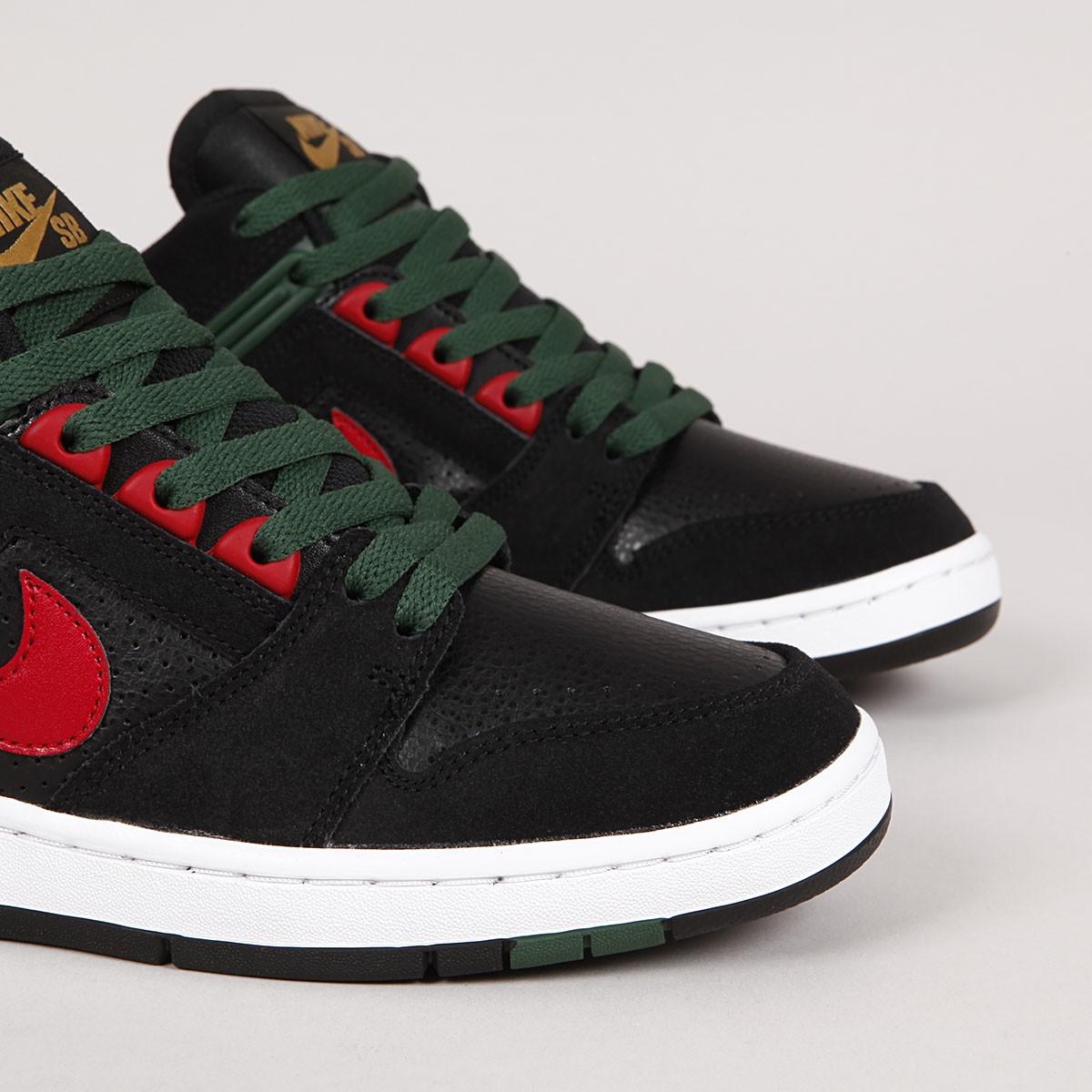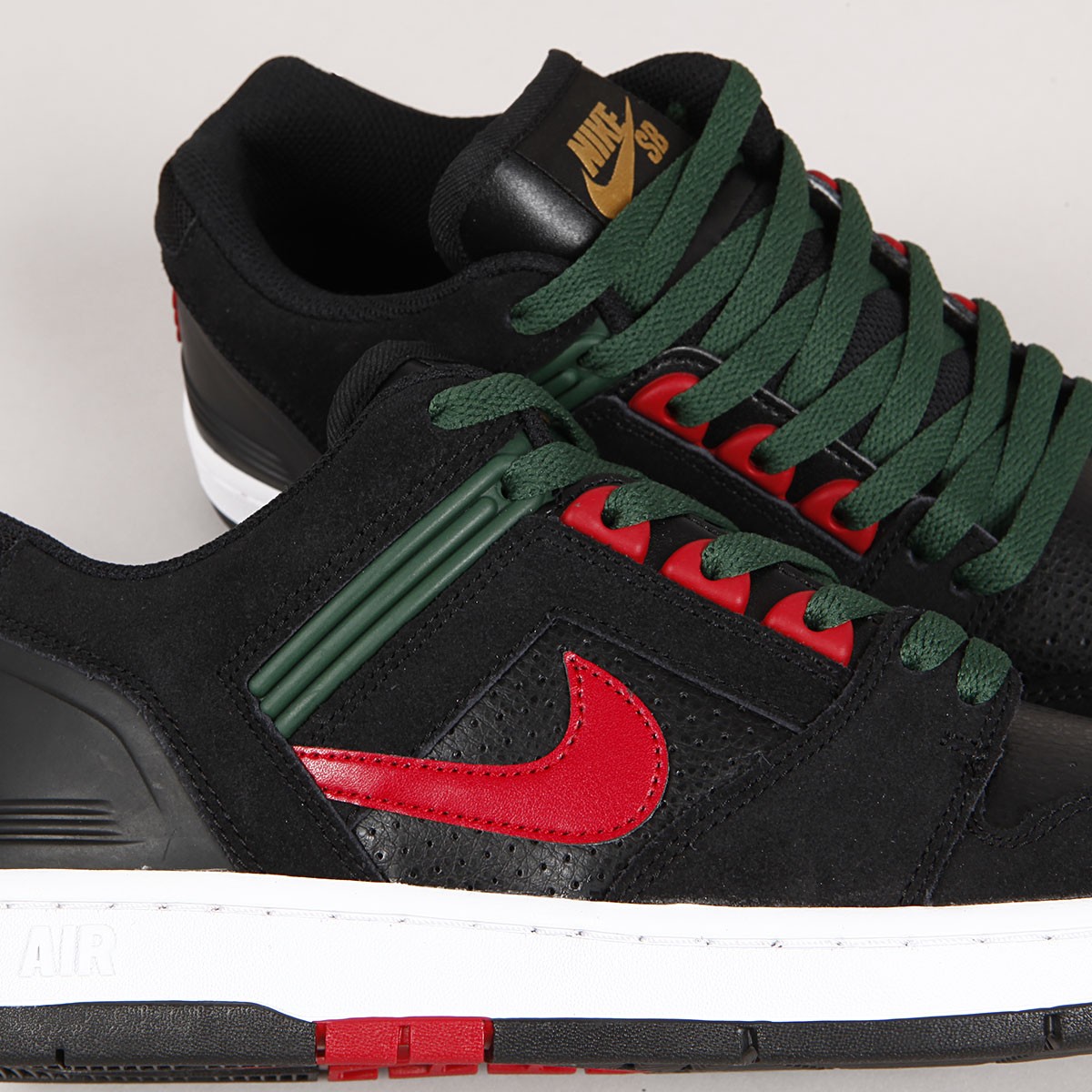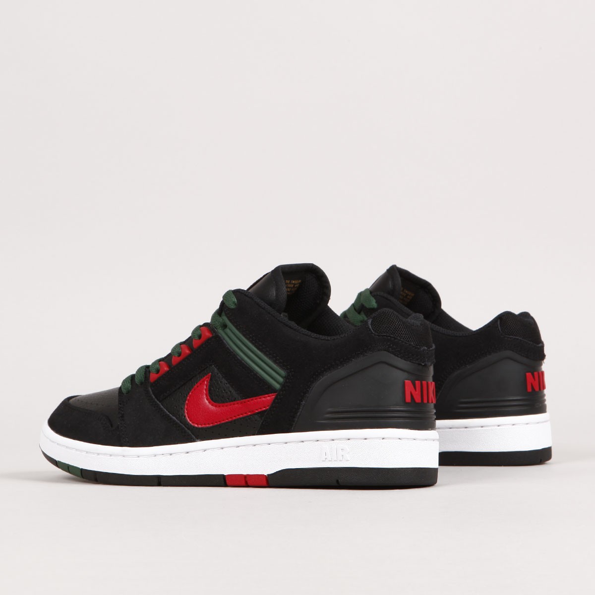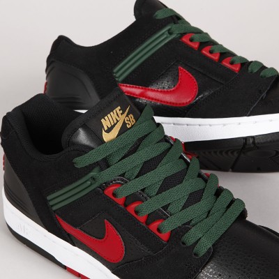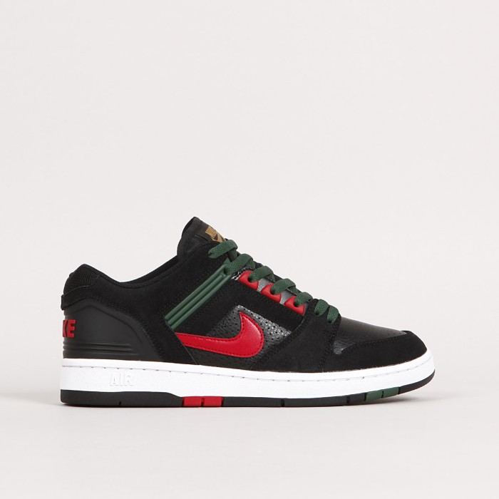 GUCCI Vibes! The iconic Air Force II Low from the Nike SB collection returns in Black/Gym Red - Deep Forest, inspired by the famous clothing company. The durable upper is a combination of leather and synthetic with suede overlays and double stitching. The C upsole also features a Zoom Air cushioning unit and an improved tread pattern for better board feel and movement . A tongue gusset ensures a snug fit that guarantees excellent board contact and control. Thin, breathable tongue and ankle collar are padded for comfort. Rubber eyelets and a Nike embossed heel counter. One extra pair of laces included.