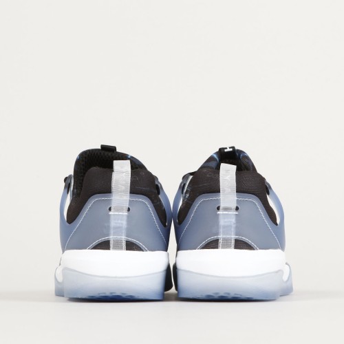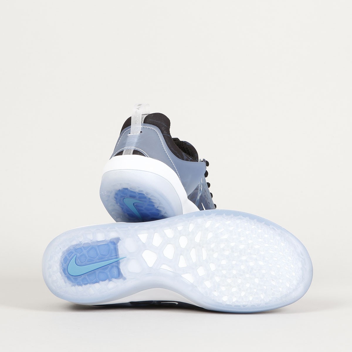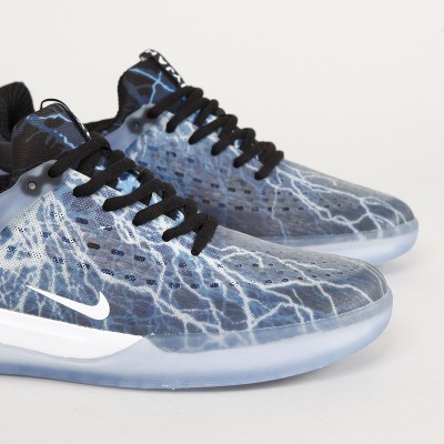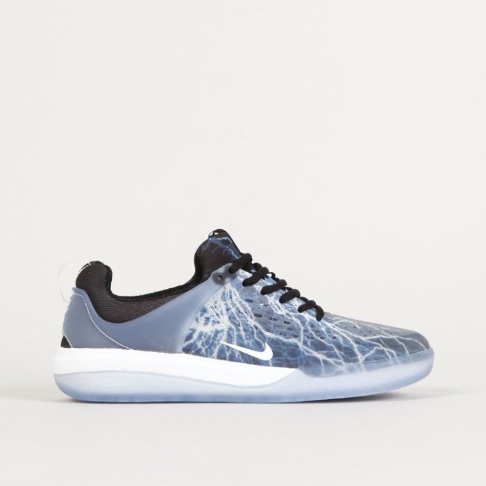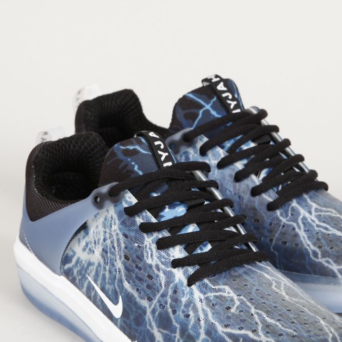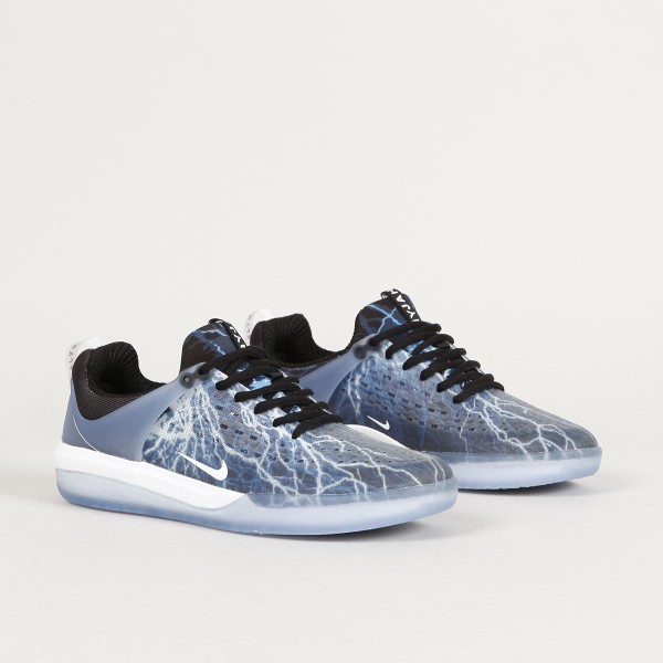 Nike Skateboarding shoes, the third pro model of rider Nyjah Huston combining the new Nike Flypate technology and the classic Air Zoom. Inspired by the Nike Air Presto model, specifically the 2015 model nicknamed "Trouble At Home" with a lightning bolt motif. Nyjah Free 3 are comfortable shoes in a low version with a vulc sole and a soft midsole with an Air Zoom cushion under the heel for shock absorption. Rubber upper with perforations on the toe and instep for better breathability. NYJAH loop on the tongue and the Nike SB logo embossed on the heel. Subtle piping printed on the outside and inside. Color combination Black/ White - Deep Royal - White.
