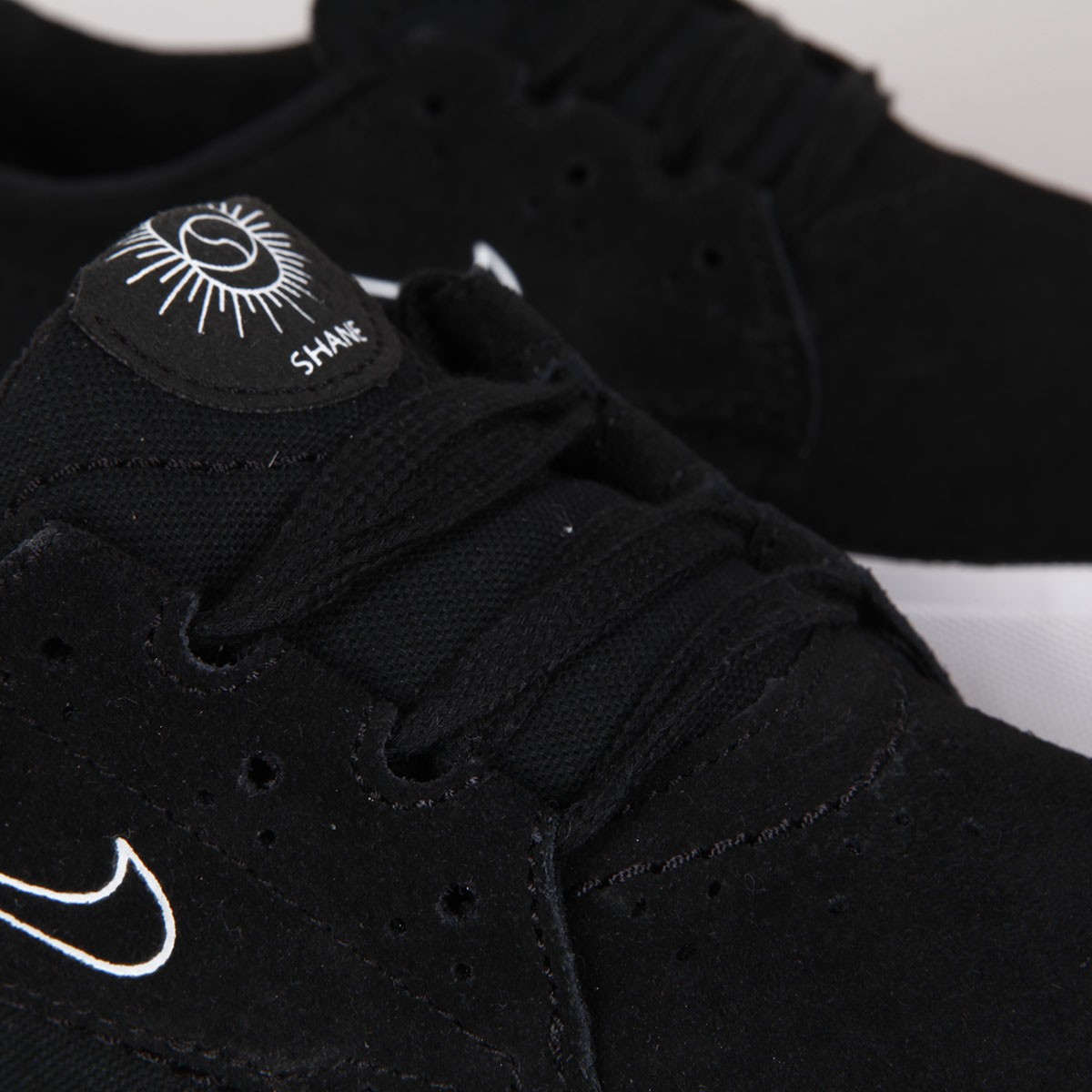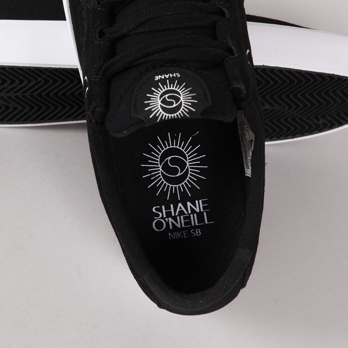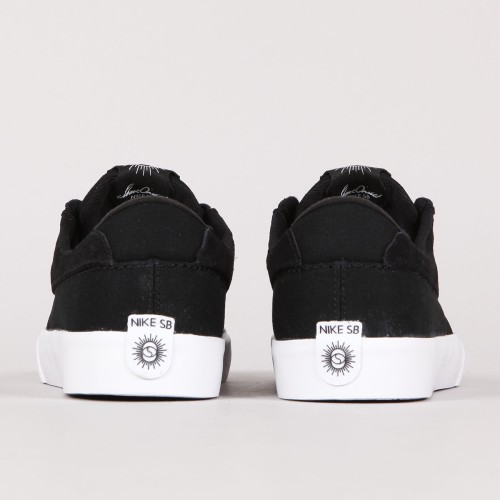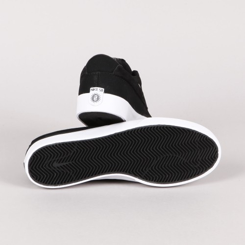 Nike SB shoe model, Shane O'Neill's pro-model in Black White. The first custom silhouette of rider Shane O'Neill's shoe in 15 years with SB. Low profile in a combination of suede and reinforced canvas, classic volcanic sole with a herringbone pattern. Elastic gusset on the tongue ensures a perfectly fitting cut, for better contact with the board and its control. Hidden laces and perforations in the instep area. Insole with Zoom Air technology in the heel for shock absorption. The tongue and insole feature Shane O'neil's signature and the swoosh is embossed on the side of the shoe. A small Nike SB inscription on the heel.