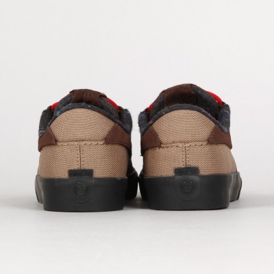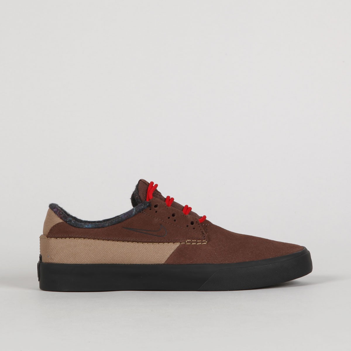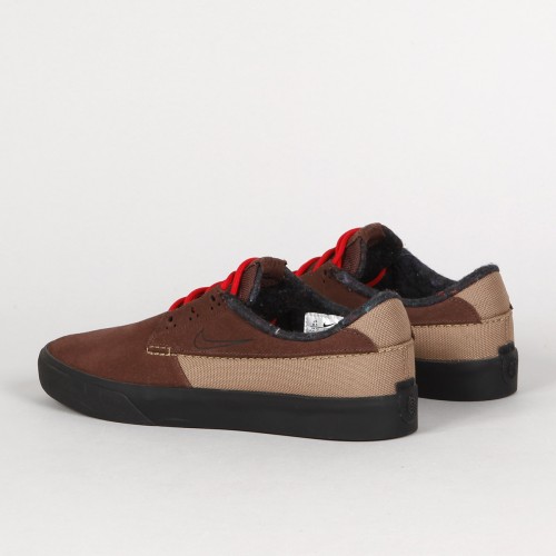 Premium model of Nike SB shoes , Shane O'Neill's pro-model in the colorway LT Chocolate/ Black- DK Driftwood- Black. The first custom silhouette of rider Shane O'Neill's shoe in 15 years with SB. Low profile in a combination of leather and reinforced canvas, classic volcanic sole with a tree pattern. Insulated design. Elastic gusset on the tongue ensures a perfectly fitting cut, for better contact with the board and its control. Hidden laces and perforations in the instep area. Insole with Zoom Air technology in the heel for shock absorption. The tongue and insole feature Shane O'neill's signature and the swoosh is embossed on the side of the shoe. A small Nike SB inscription on the heel.