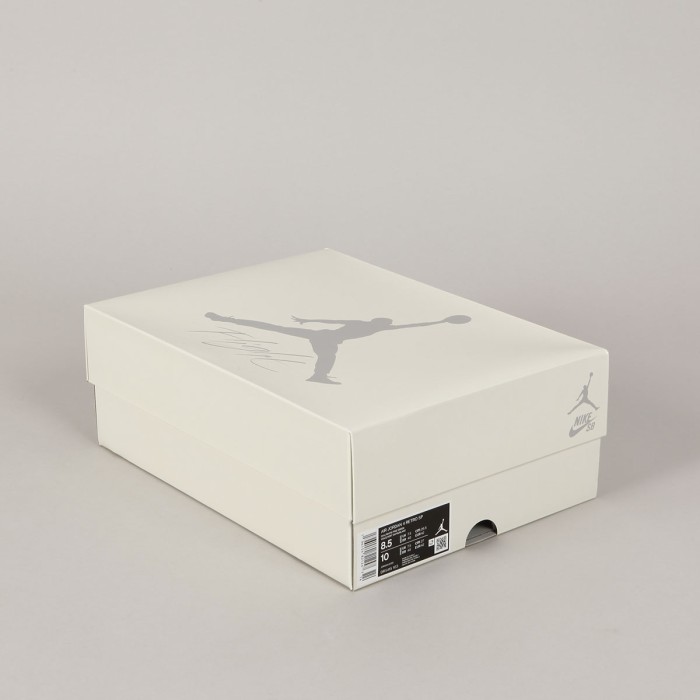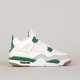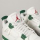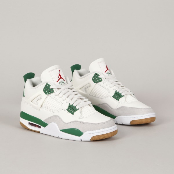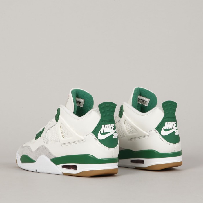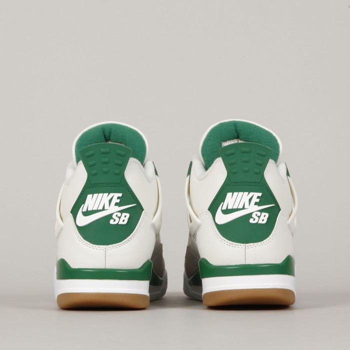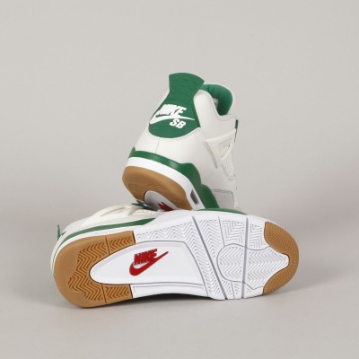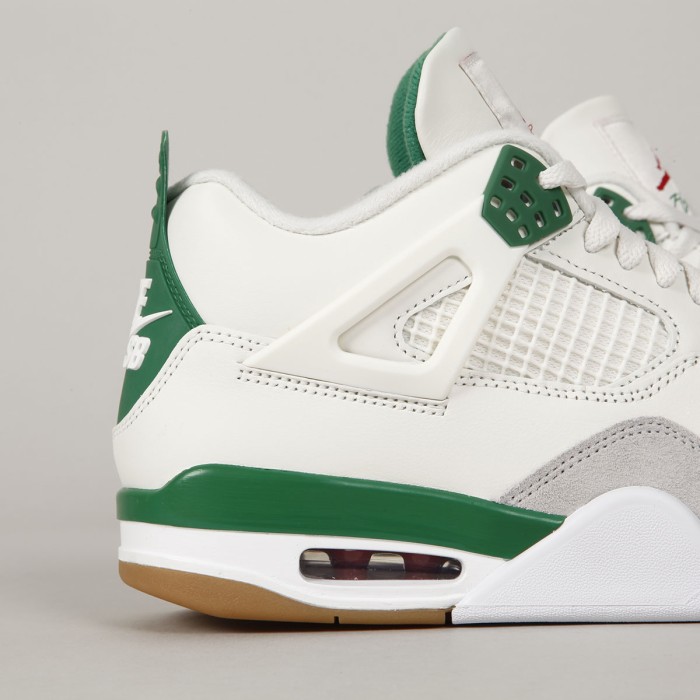 The iconic Air Jordan 4 Retro model in collaboration with Nike SB has a Sail/ White- Pinge Green- Neutral Grey aka "Pine Green" colorway. The Jordans are modified for skateboarding. The upper mesh is made of a rubber compound, the sole is slightly thinner and has more rubber parts, the tongue is more padded. The retros have an upper made of a combination of suede and smooth leather with a rubber mesh. The lightweight sole with an Air bubble under the heel absorbs shocks and at the same time ensures sufficient board feel. Breathable tongue and padded ankle collar for greater comfort. 3D Nike SB logo on the back heel. Air Jordan x Nike SB logo on the tongue and insole . Packed in a cream box with Air Jordan print.