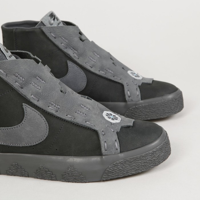 Nike SB Blazer Mid Decon ankle boots in a special limited edition collection with Native American artist and Navajo skateboarder, Di'Orr Greenwood. Raised in Diné Bikéyah in Northern Arizona, her products blend modern culture with the tribe's indigenous heritage. Di'Orr understands color, symbolism and has mastered traditional techniques. Her SB Blazer Mid Decon design is made of leather in shades of gray, drawing inspiration from the Moccasins Di'orr often skates. They have a unique leather upper with quilted details and a floral emblem. Along with a custom sockliner pattern, the sole is finished with an embossed mountain pattern and the Diné (Navajo) logo on the heel. The collection also includes the Nike SB Dunk High Decon. Nike's legendary Blazer shoe model has been reworked for the Skateboarding section. This model has a vulc sole, a swoosh sewn on the side and a Nike SB x Di'Orr Greenwood patch on the tongue. Embroidered Nike and Diné (Navajo) lettering on the heel. The insole is also equipped with Zoom Air technology under the heel and provides protection during impact and cushioning of hard impacts. Thanks to the vulc sole, the herringbone pattern perfectly adheres to various types of surfaces and guarantees great contact with the board. These shoes are primarily intended for skateboarding, but can also be used for other sports and everyday wear. Leather laces are also included in the package.