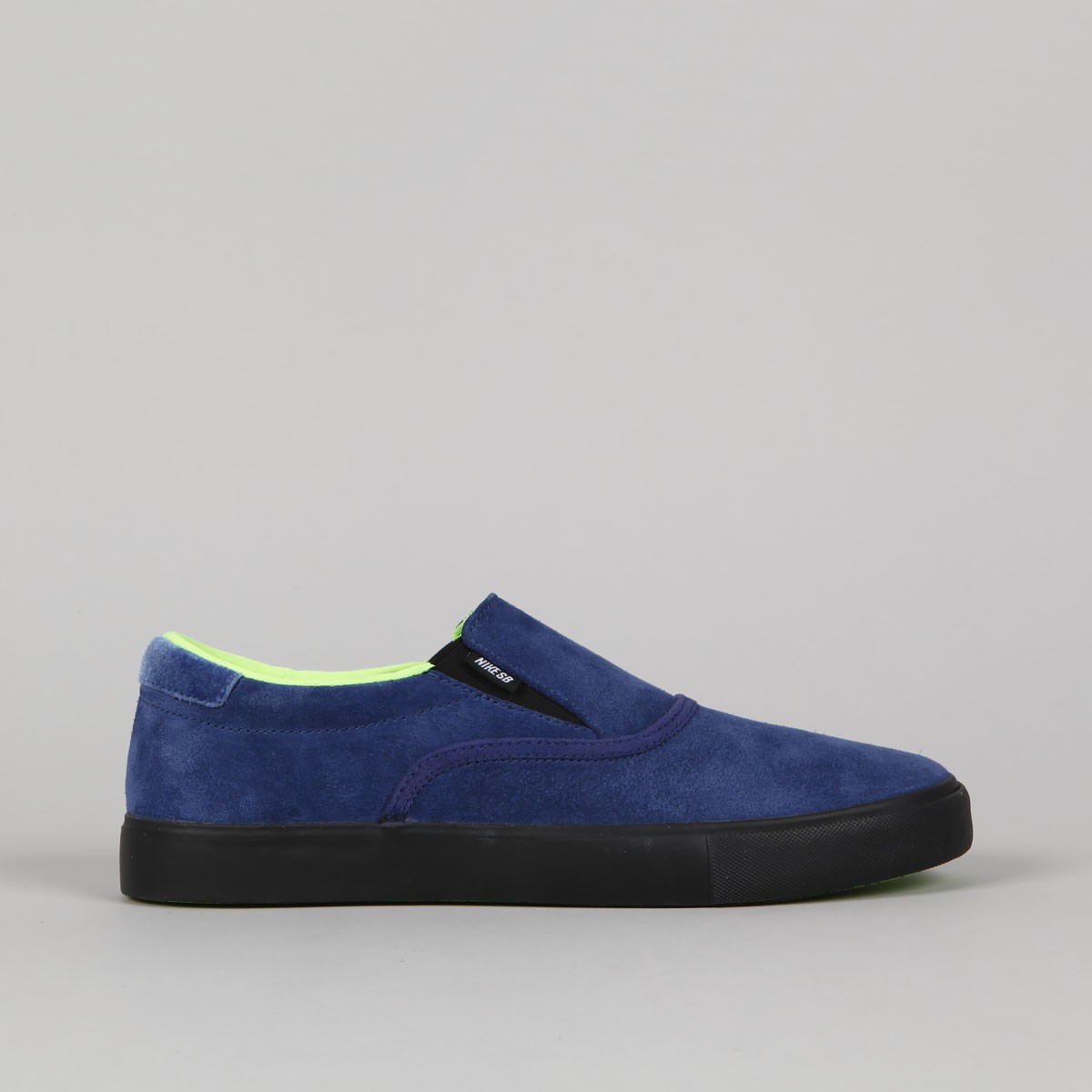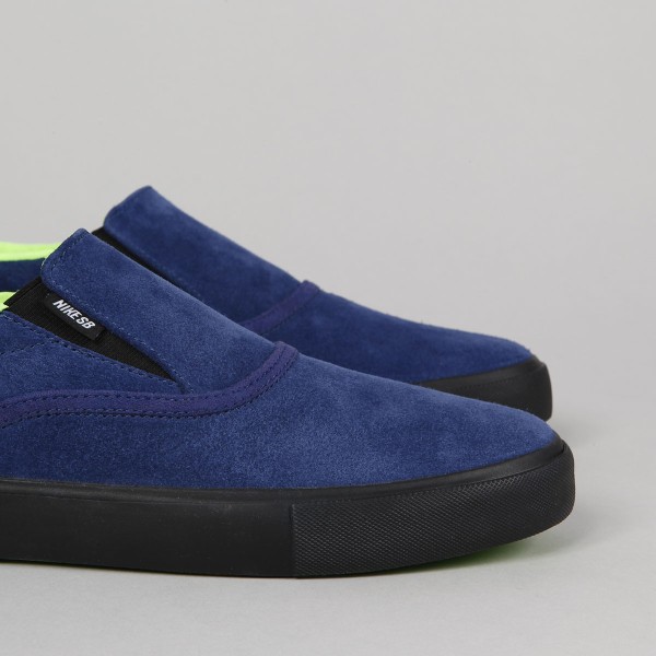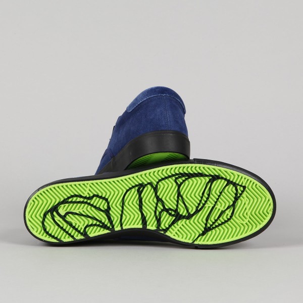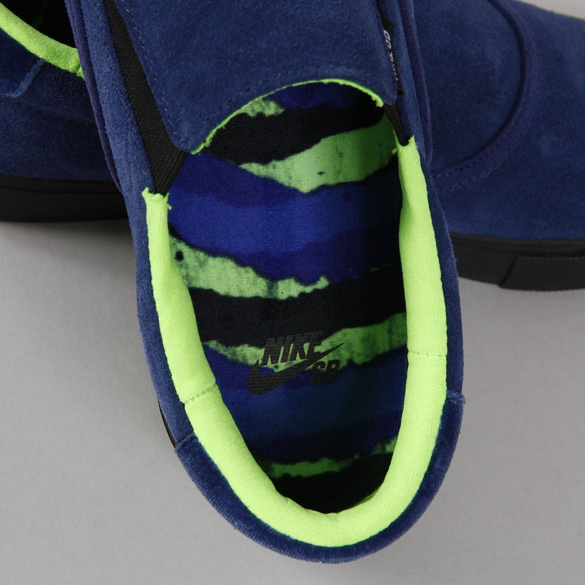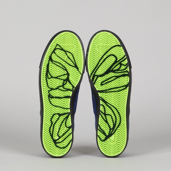 Nike SB x Leo Baker shoes , model called Verona Slip without laces. The design was contributed by Nike SB rider Leo Baker. The upper material is suede, the sole is vulcanized with improved connection to the upper. Double stitching on the toe. The insole has a built-in Zoom Air cushion for shock absorption. The inner heel rim is padded with lime suede and a small patch with the Nike SB inscription on the tongue. There are hand-drawn graphic motifs inside the shoe and on the sole.