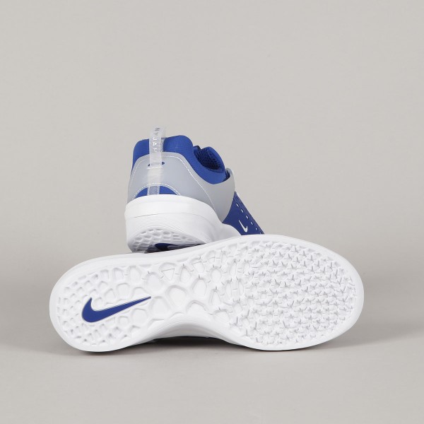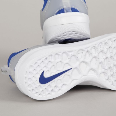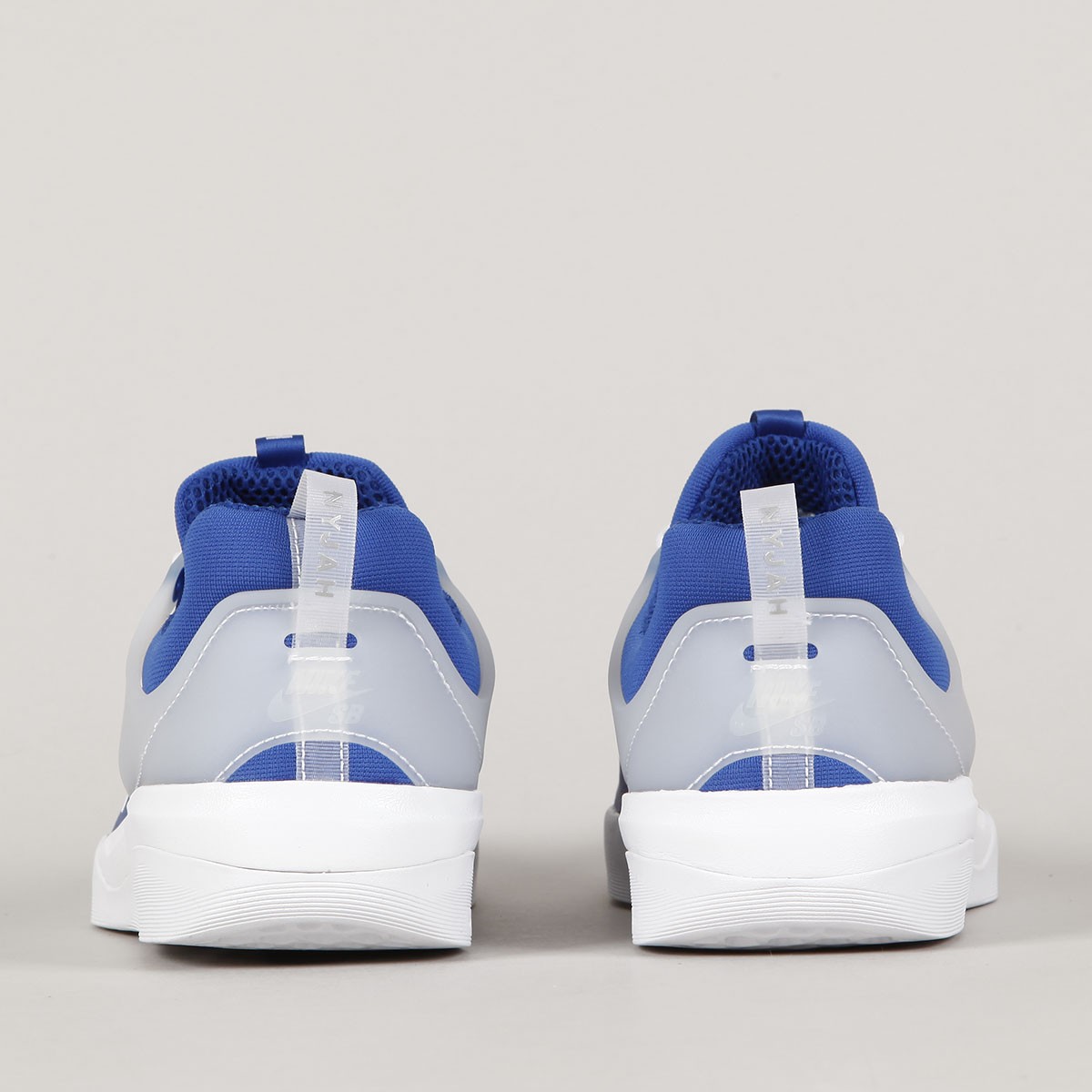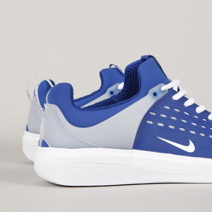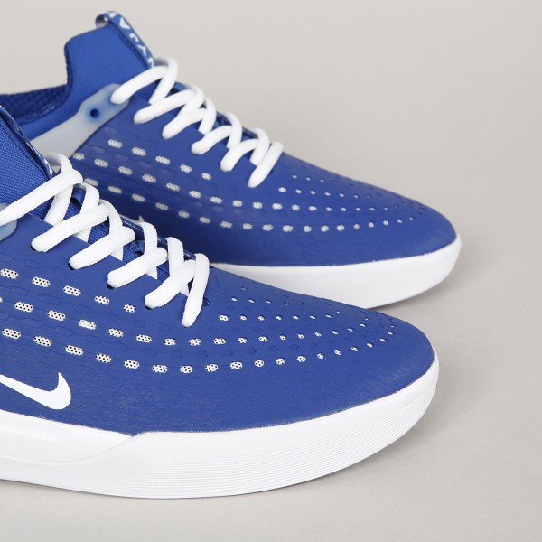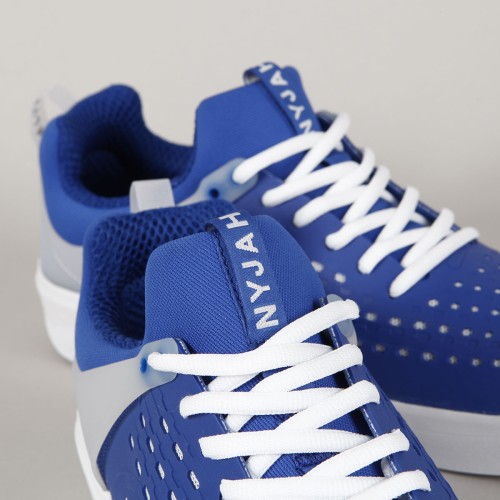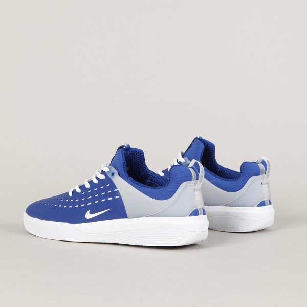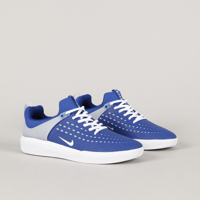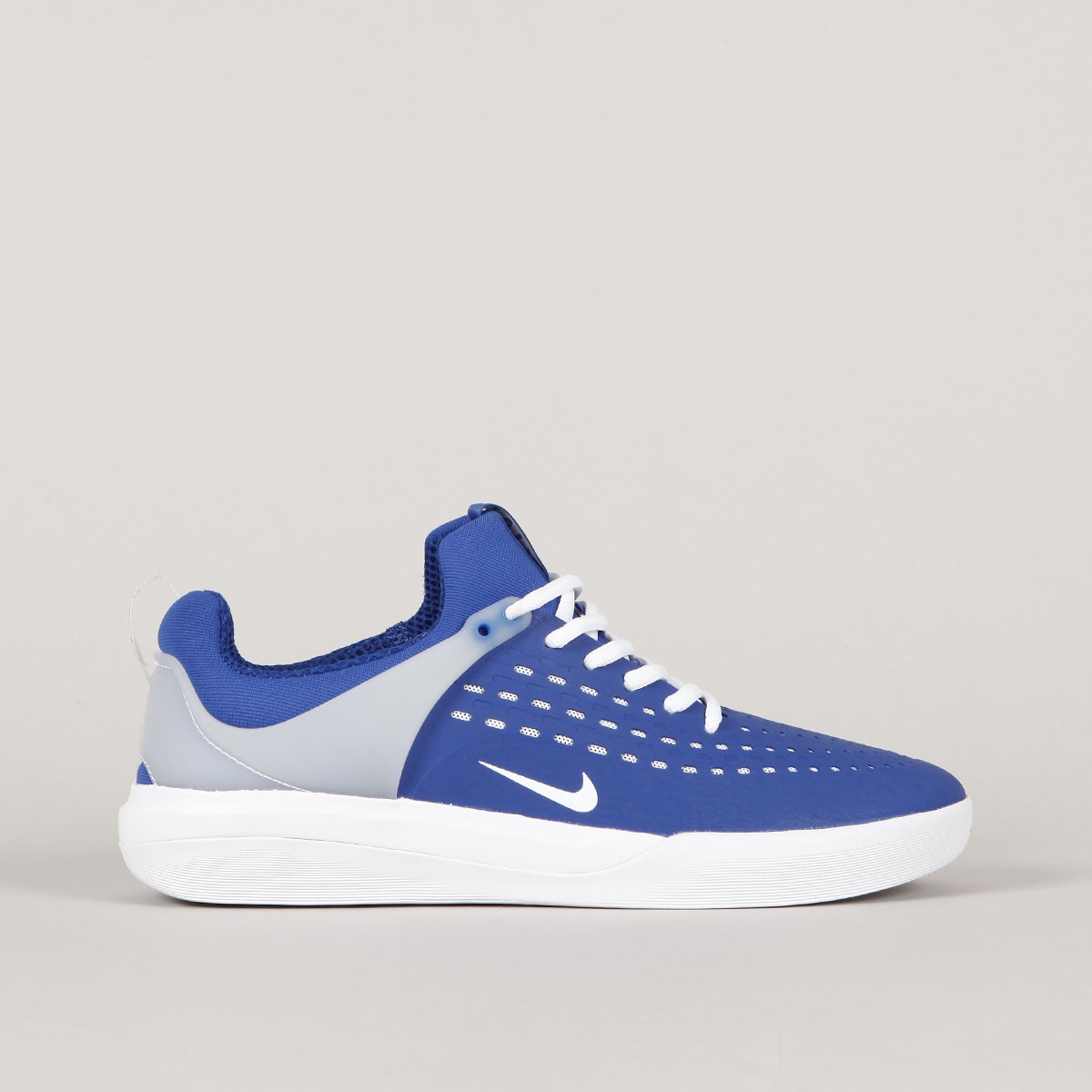 Nike Skateboarding shoes, the third pro model of rider Nyjah Huston combining the new Nike Flypate technology and the classic Air Zoom. Inspired by the Nike Air Presto model. Nyjah Free 3 are comfortable shoes in a low version with a vulc sole and a soft midsole with an Air Zoom cushion under the heel for shock absorption. Rubber upper with perforations on the toe and instep for better breathability. NYJAH loop on the tongue and the Nike SB logo embossed on the heel. Subtle piping printed on the outside and inside. Color combination Game Royal/ White- Game Royal.