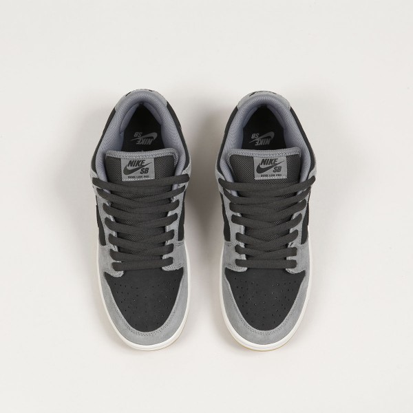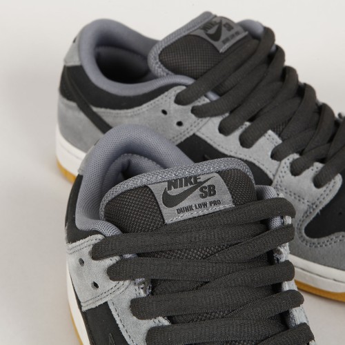 Nike SB Dunk Low Pro shoe model in a combination of smoke gray and black . It looks worn-in from the first time you put it on. The low version has an upper made of suede with a perforated toe, the lightweight cupsole sole also has a Zoom Air cushion for shock absorption. The wedge on the tongue ensures a perfectly fitting cut, which guarantees excellent contact with the board and its control. Thicker textile tongue with the Nike SB logo and padded ankle collar for greater comfort, classic black leather swoosh on the side. One extra black laces in the package.