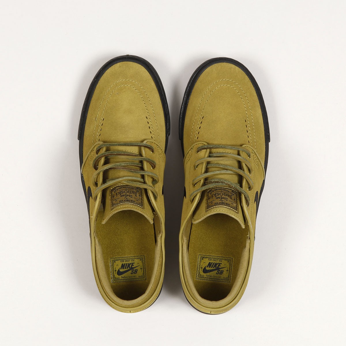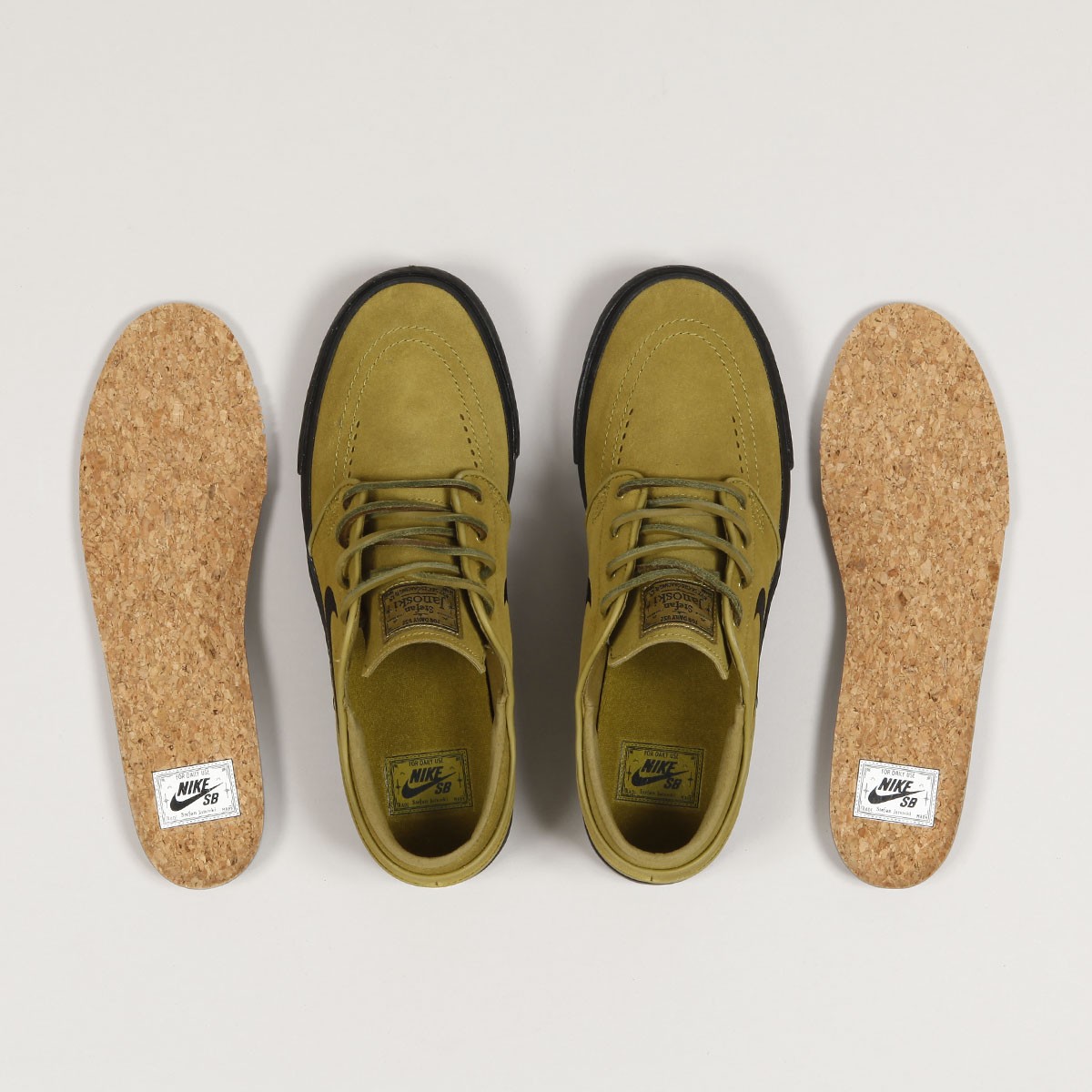 The Nike SB Original Plus Janoski with leather laces is back in a limited Quickstrike edition. The Stefan Janoski OG Plus Pro model comes in a classic Pacific Moss Black colorway. Low-cut suede upper, ventilation eyelets on the toe, and a classic vulcanized sole with a tree-like pattern. The tongue features a Nike Skateboarding patch and an embroidered Nike logo on the side. Inside, there is a cork sockliner with a Zoom Air unit for shock absorption. The package also includes spare sockliners and round laces.