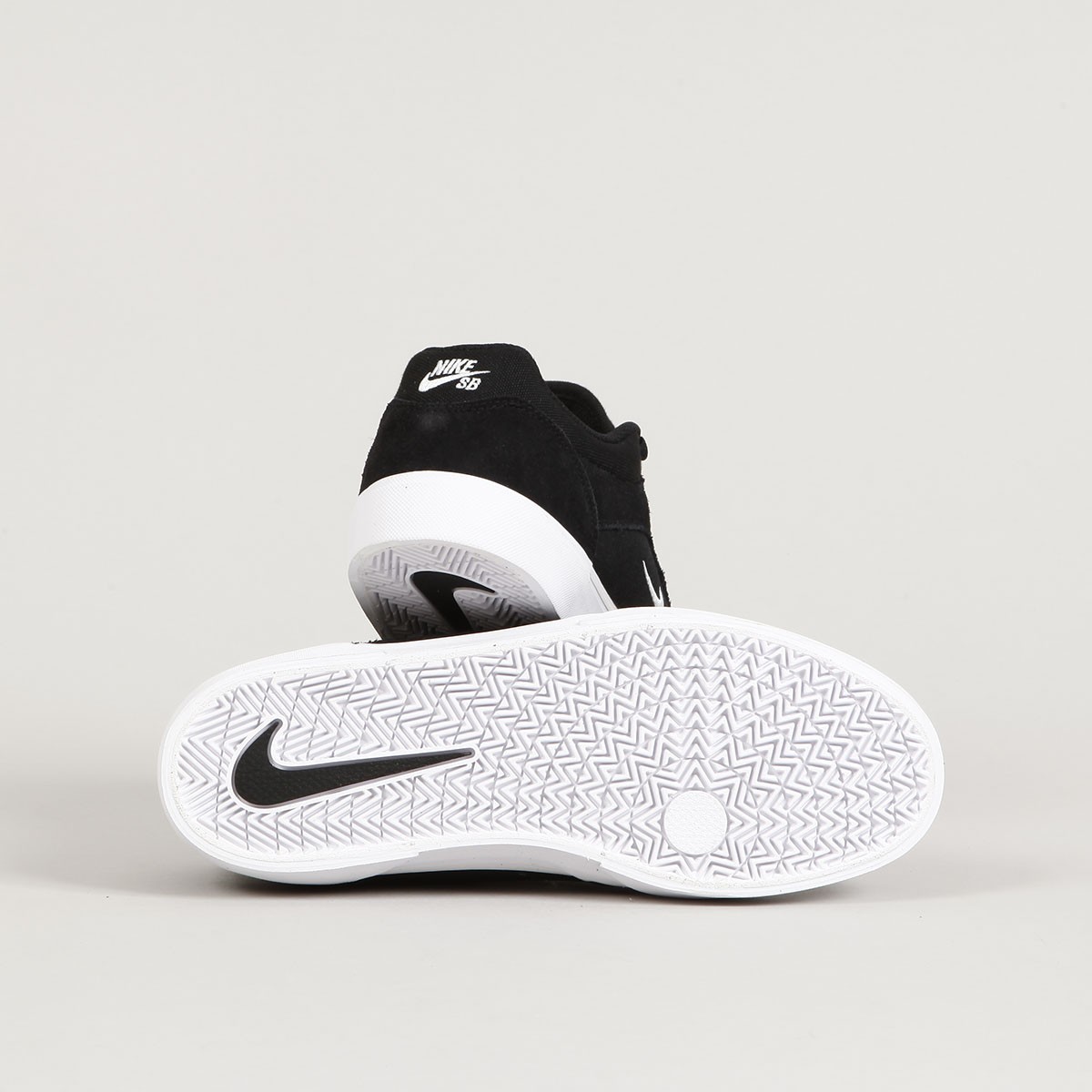 Nike SB skateboarding shoes called Malor in Black White. The upper is made of a combination of suede and reinforced canvas. A thin and breathable tongue ensures sufficient airflow. Dual-density Solarsoft foam for impact absorption and a vulc sole combining a herringbone pattern with a circular Air Force 1 pattern improves grip and movement. Layers of suede and canvas increase durability, especially on the toe, but also on the rest of the shoe. The upper eyelets are metal. Swoosh sewn on the side and the Nike SB logo on the tongue and heel.