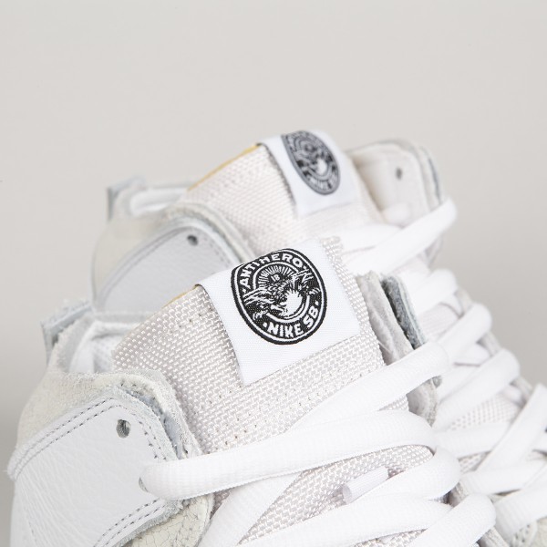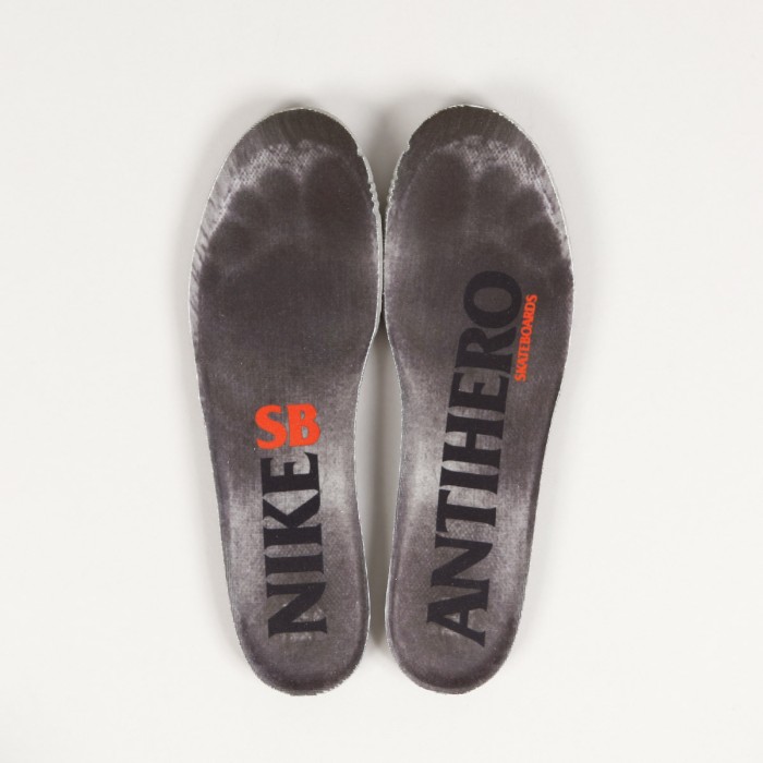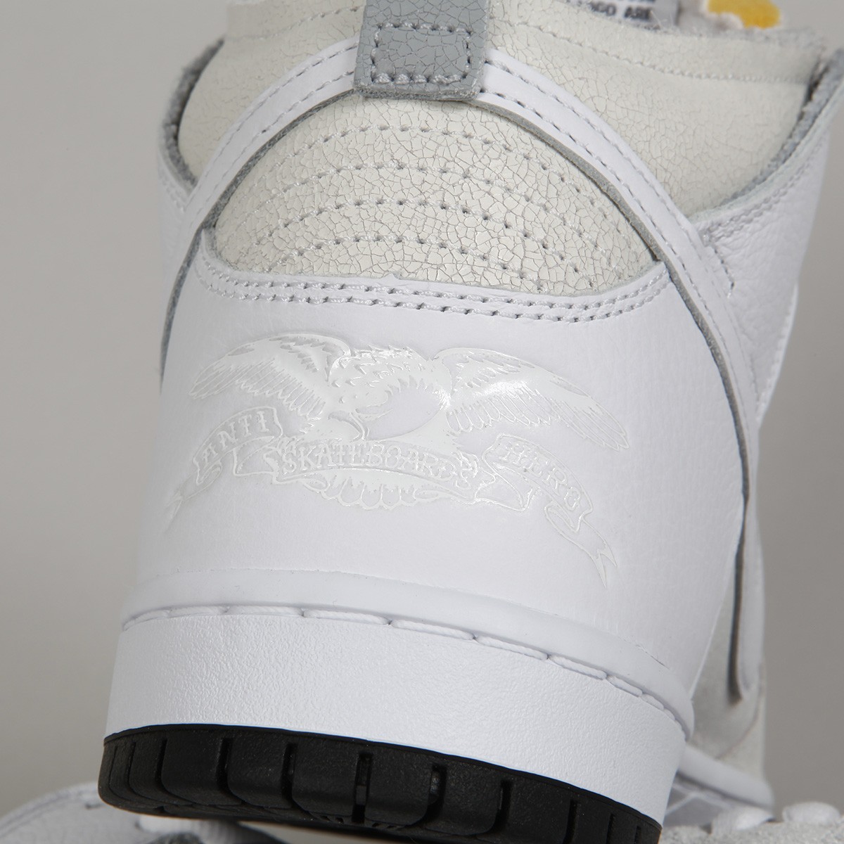 The legendary Nike SB Dunk High model in a special limited edition collection with the Anithero Skateboards brand. It was founded in the mid-90s by skater Julien Stranger. In addition to skateboards, their production has expanded to skate clothing and accessories. You can find names like Grant Taylor, Brian Anderson, John Cardiel, Chris Pfanner and others in their team. The ankle version has an upper made of premium materials, including textured leather and suede, the lightweight cupsole sole also has a Zoom Air cushion for shock absorption. The slogan "Stay Ready" is printed on the bottom of the cushion. The wedge on the tongue ensures a perfectly fitting cut, which guarantees excellent contact with the board and its control. Exposed, lighter tongue and padded ankle collar for greater comfort, leather swoosh on the side. Nike SB x Antihero logo on the tongue and insole . Eagle logo embossed on the heel. The insoles also have Nike SB x Antihero graphics.