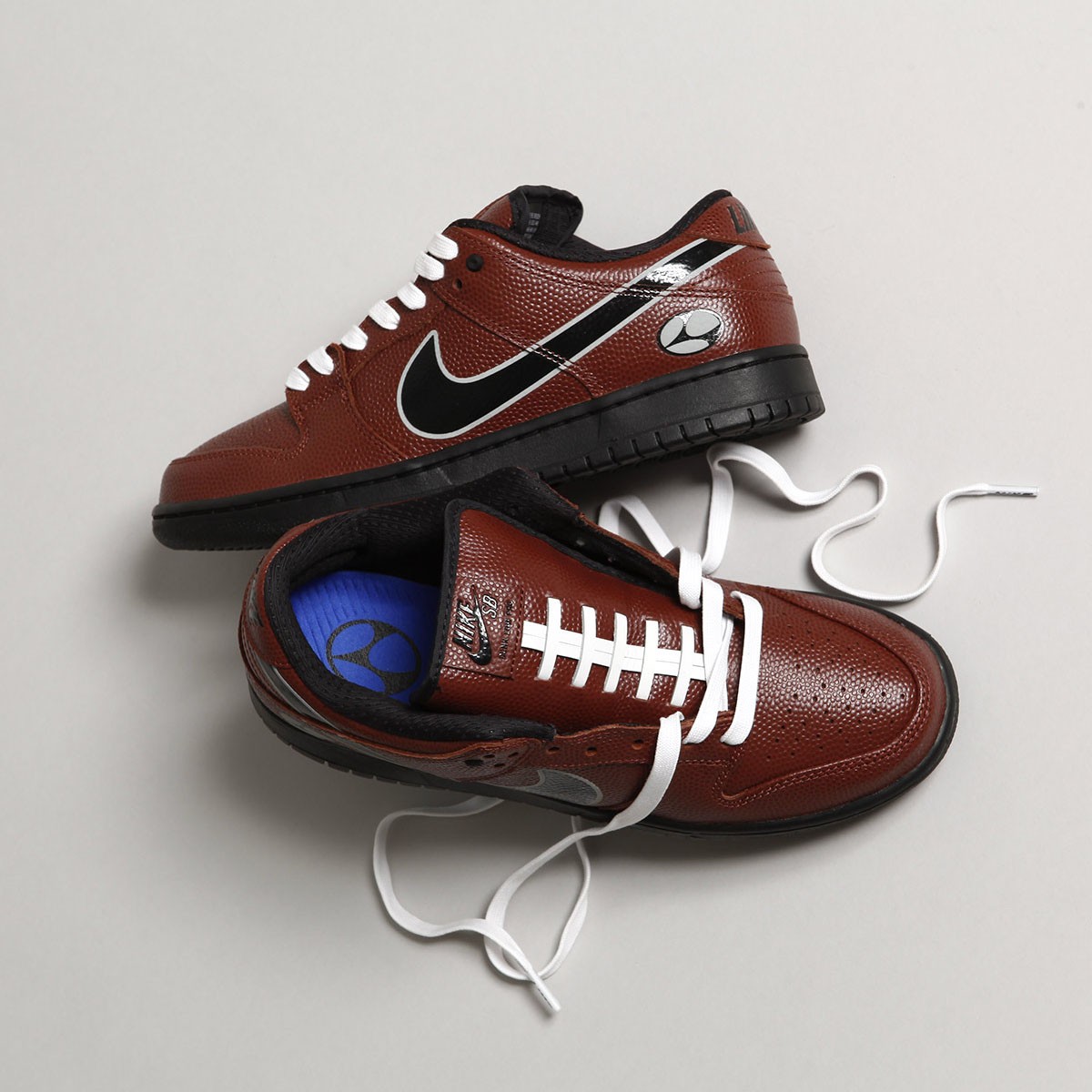 The Nike SB Dunk Low Pro x Limosine is bold and no-nonsense – taking a skate classic and reimagining the Dunk silhouette in homage to those moments when you just throw a ball around and the world stops for a moment. The Limosine Dunk is made from soccer-textured leather, accented with a chrome Swoosh outline, a signature Limo graphic and a bold black outsole. And to make it clear what these shoes are, the bright blue upper insole was designed after professional football boots and bears the logos of both brands. Now hold on: the Limosine Dunk comes in four soccer lace options and an Americana-style Limosine logo on the heel.