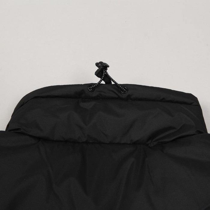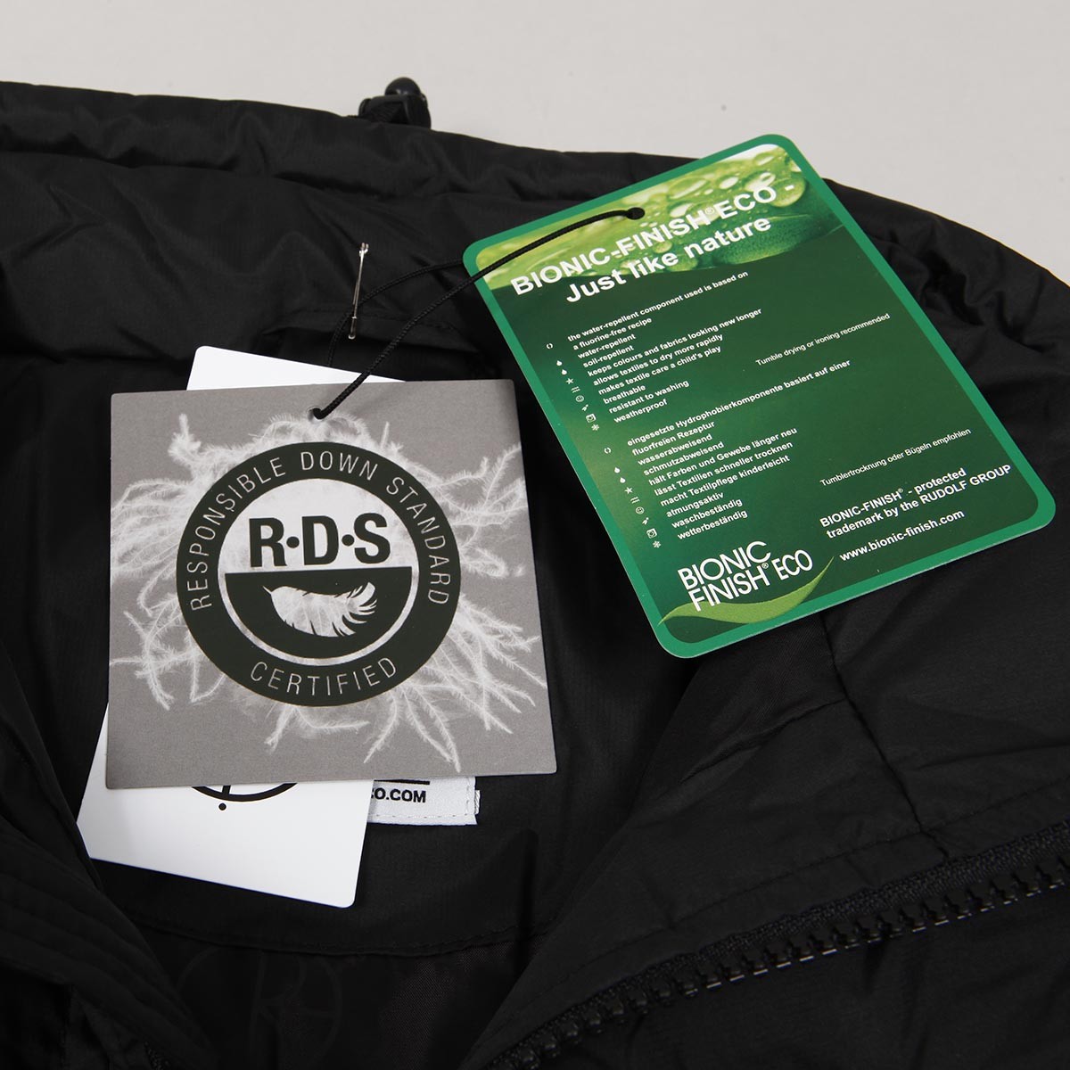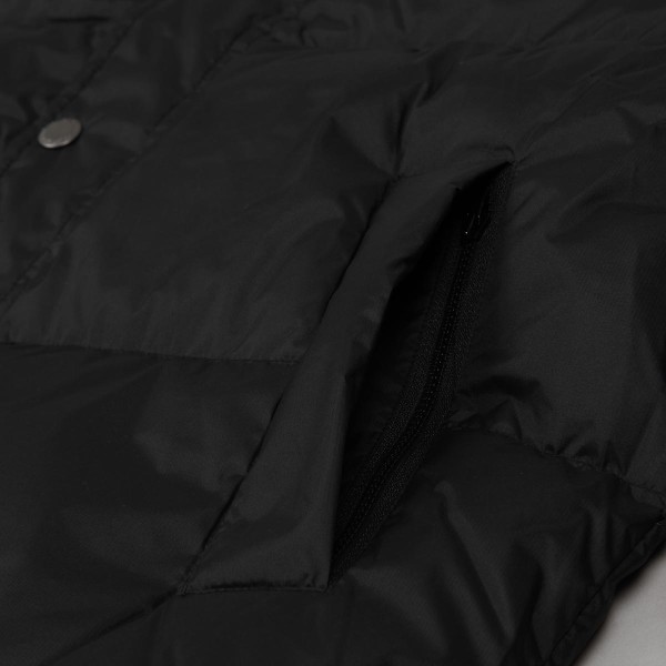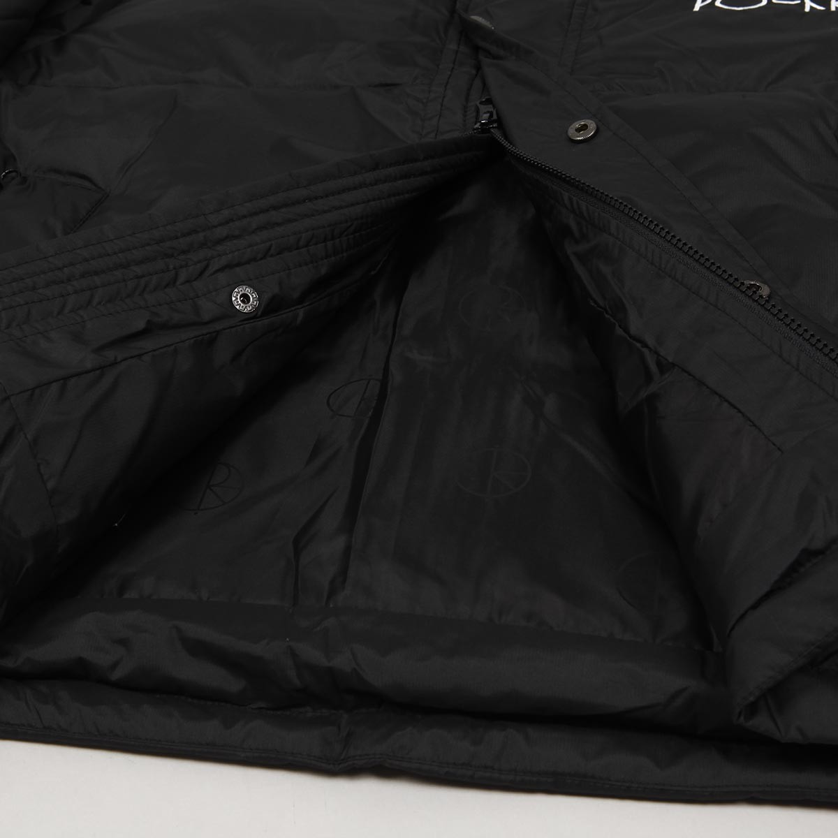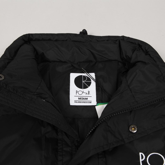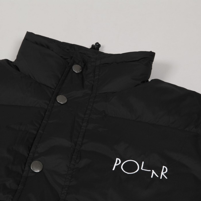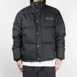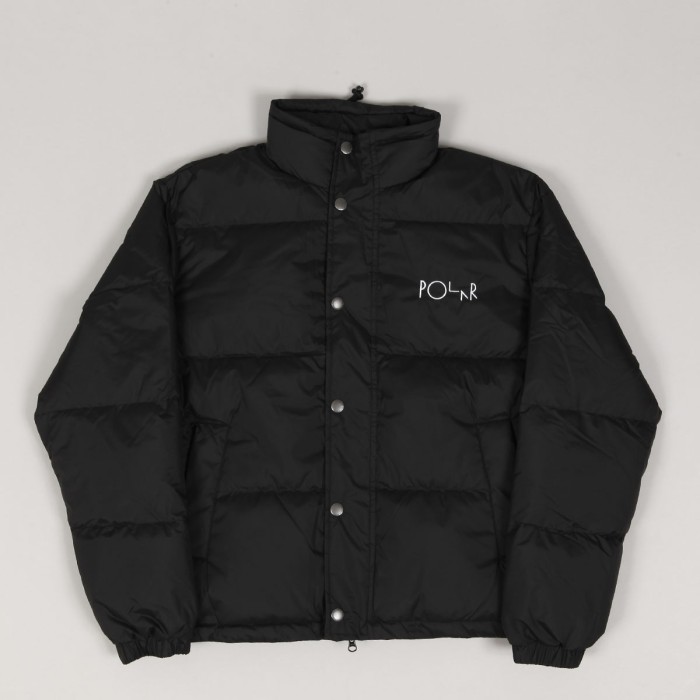Polar Skate Co. jacket called Basic Puffer Jacket in black. Small white POLAR inscription embroidered on the left chest. Thicker breathable jacket with YKK two-way zipper and studs. Two side pockets and two hidden inner pockets. Elastic waist and collar adjustment. Filled with RDS certified down and top protection with natural bio impregnation. Material 100% polyester.