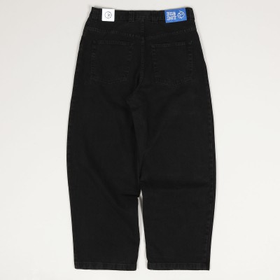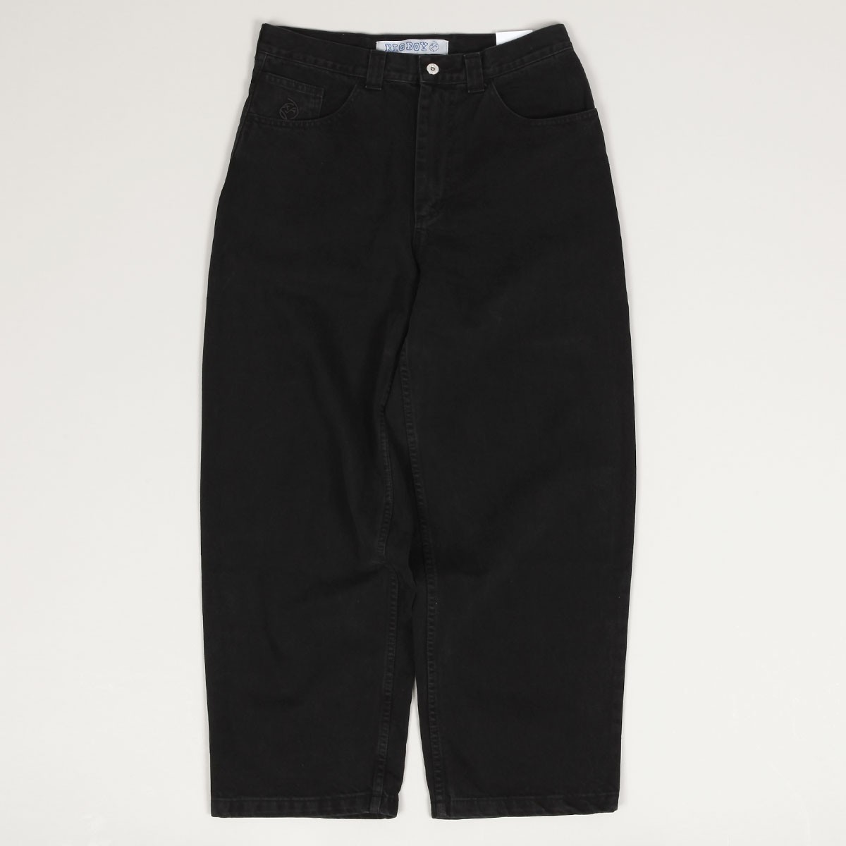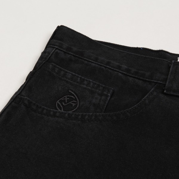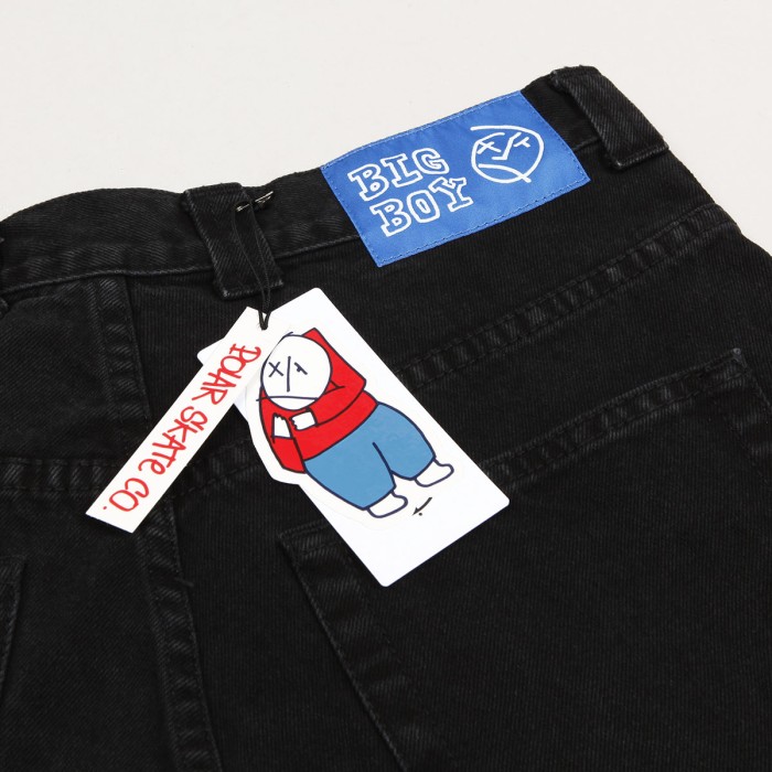 Polar Skate Co. pants called Big Boy Jeans in black. They have a super wide retro cut with wide legs. They fasten with a covered zipper and button. In the right pocket there is a smiley face patch. Made of 100% cotton, 435 g. Made in Poland.