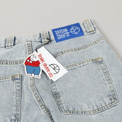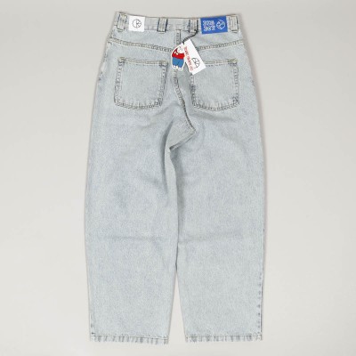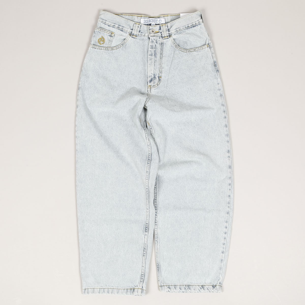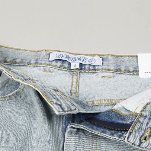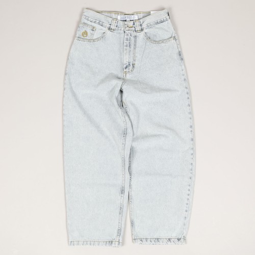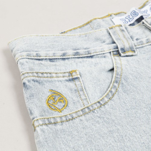 Polar Skate Co. pants called Big Boy Jeans in light blue. They have a wide retro cut with wide legs. They fasten with a covered zipper and button. In the right pocket there is a smiley face patch. Made of 100% cotton, 435 g. Made in Poland.